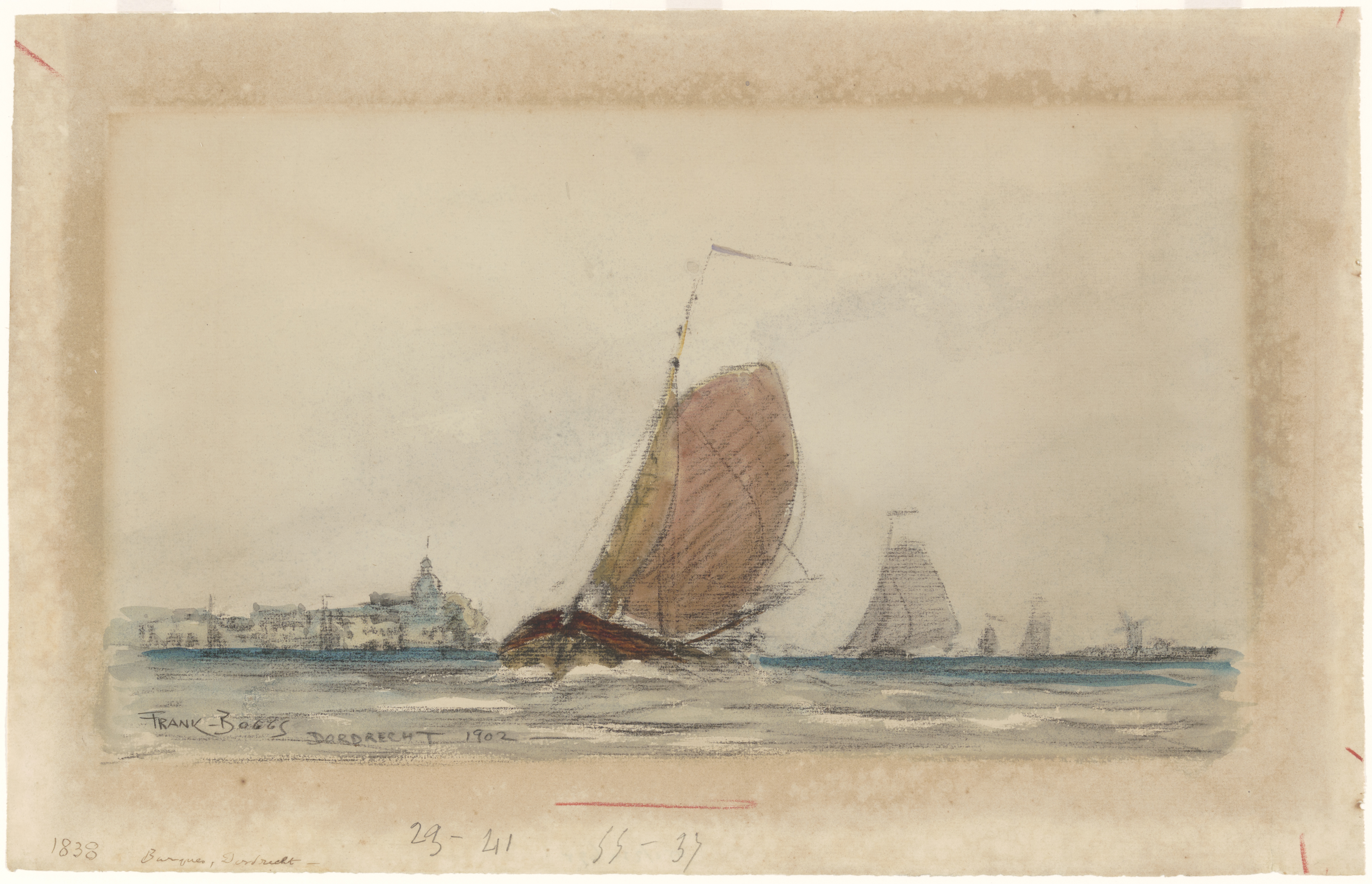 - Gezicht op Dordrecht met op de achtergrond de Groothoofdspoort met zeilschepen op de Merwede