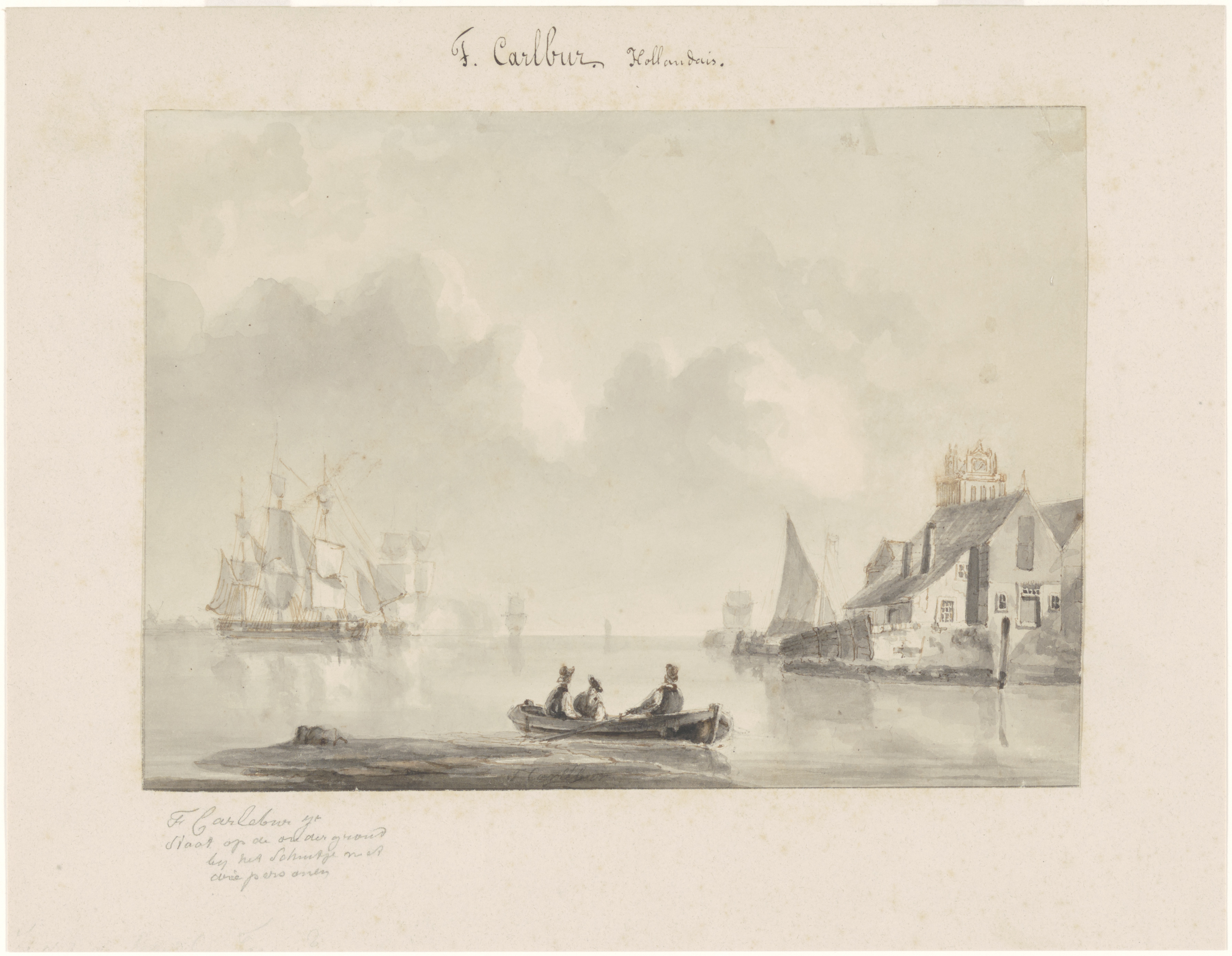 (tekening) F. Carlbur, Hollandais / F. Carleburg Jr, staat op de ondergrond bij het schuitje met drie personen; (toren Grote kerk, zeilschepen)