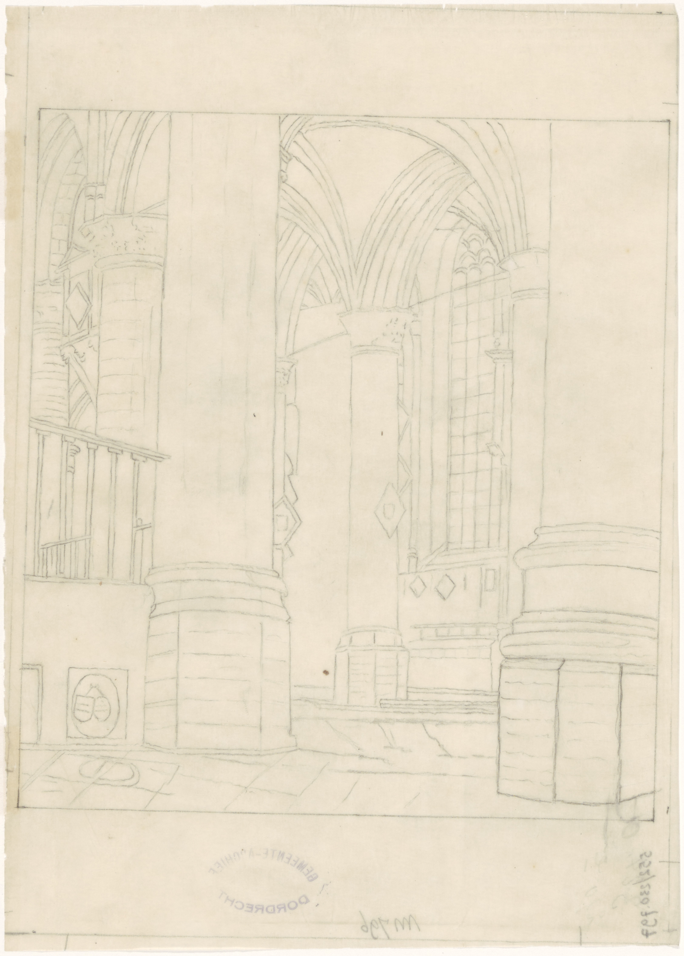 Maar nog iets, de opschriften staan in spiegelbeeld. Maar als we het plaatje spiegelen kan ik de situatie niet meer plaatsen... Nog iets over de herkomst. Je kan denken aan iets van Jan Rutten. Ik weet niet of hij consequent signeerde, maar hier is dat niet gebeurd; rechts wel het huidige inventarisnummer van deze tekening (ook spiegelbeeldig). Maar we zien ook nog overal wapenborden in de kerk hangen en die zijn met de Franse tijd na 1795 verdwenen. Het lijkt me dus van een andere tekenaar, voor 1795, of een latere kopie.