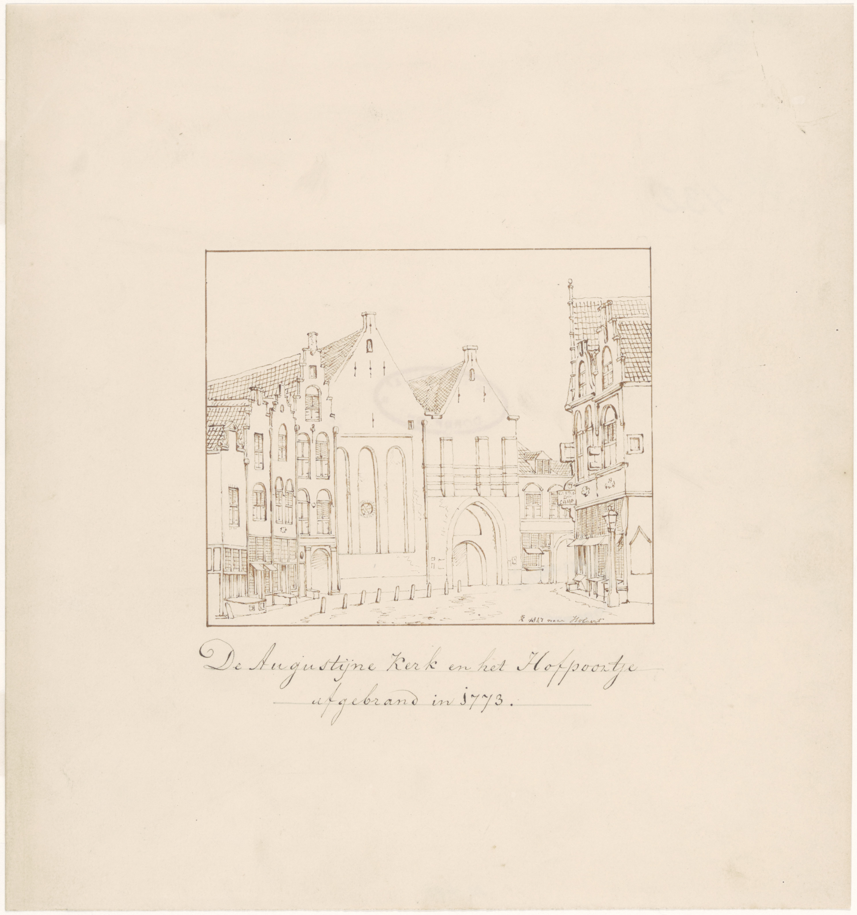- Tekening door Jan Rutten (naar Holaert) van de Augustijnenkerk en het hofpoortje aan de Voorstraat.