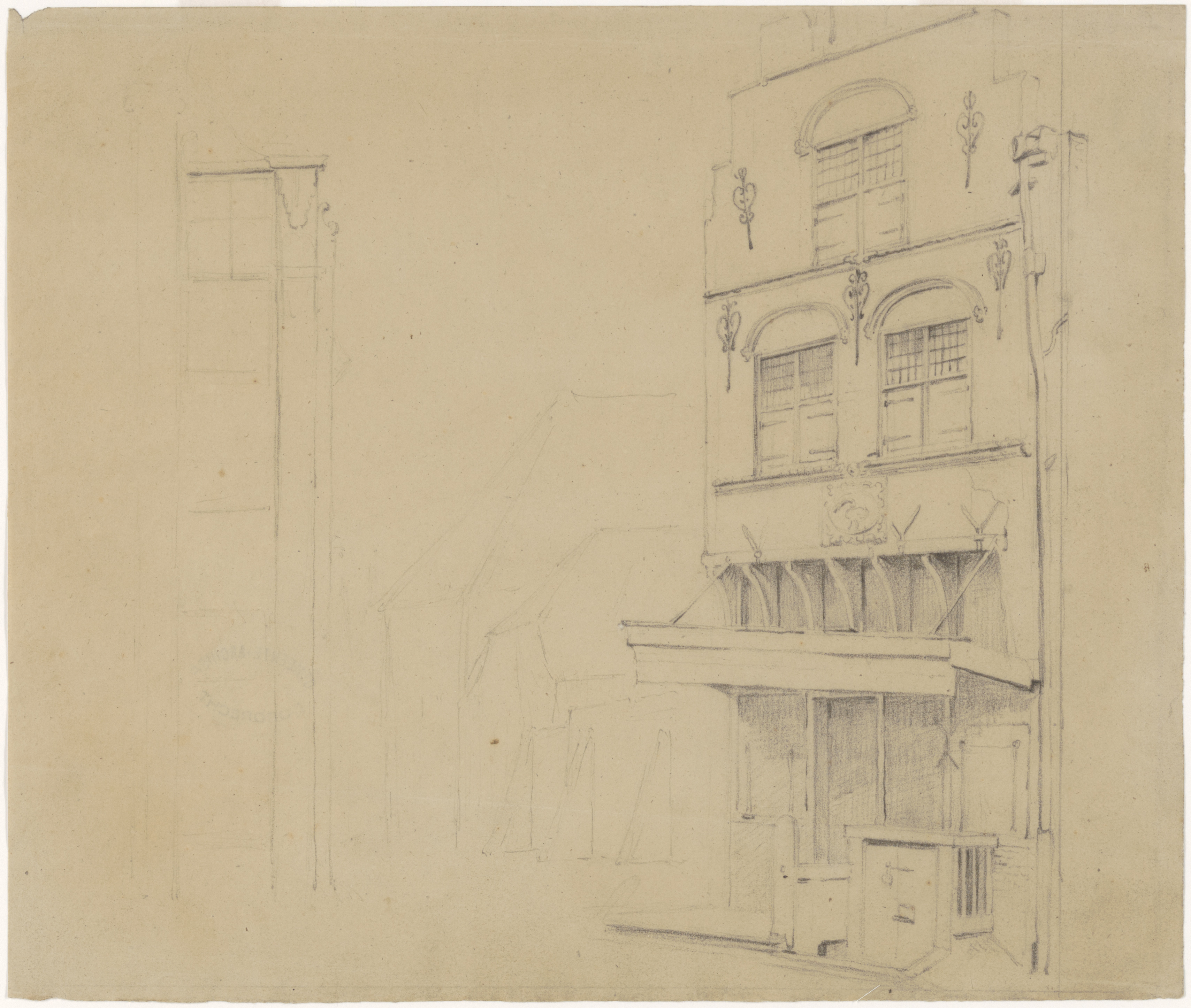Tekening van Huis De Zwaan aan de Voorstraat tegenover de Nieuwbrug en naast de …