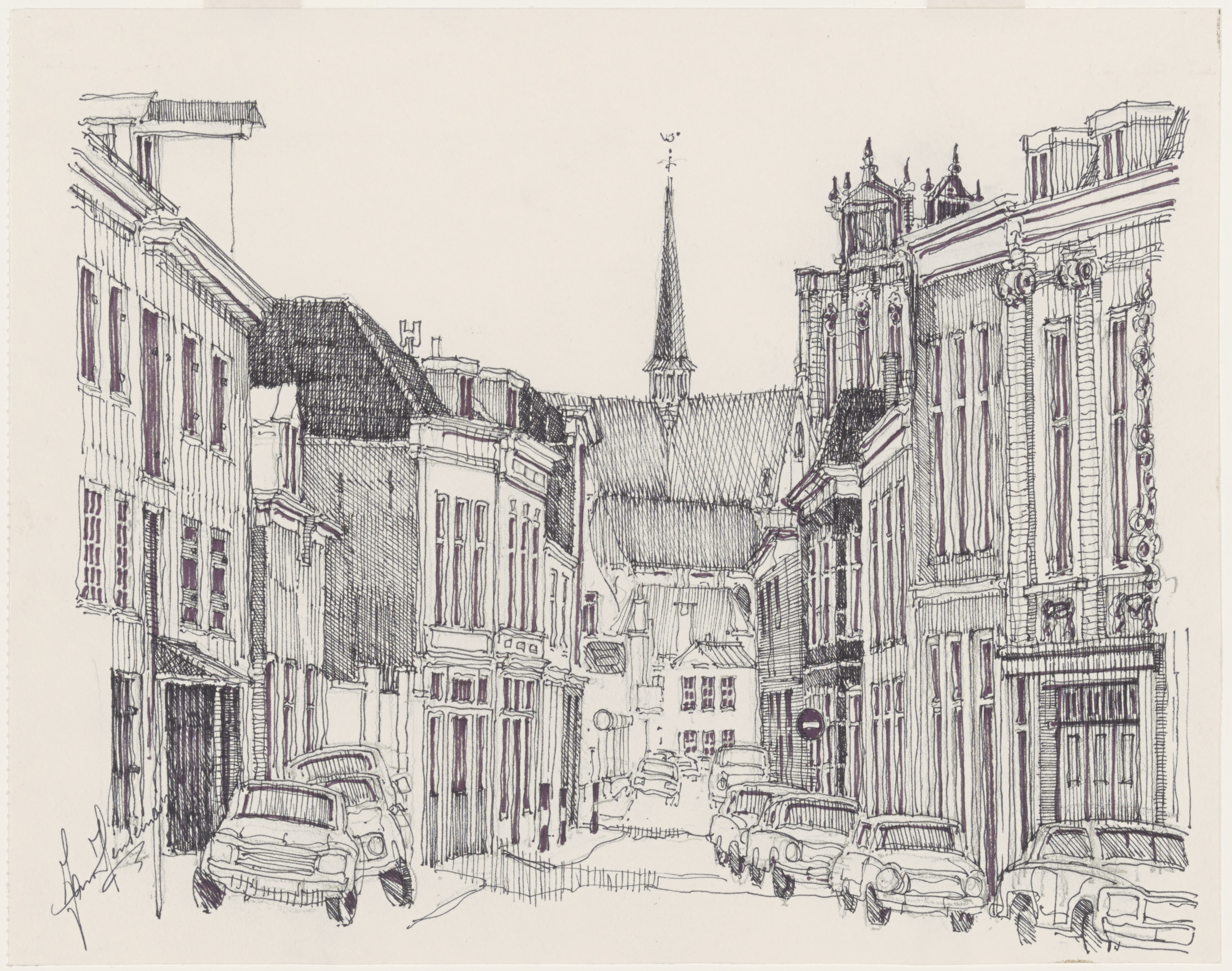 - Tekening door Jan Hensema van de Varkenmarkt richting Houttuinen en Grote Kerk..