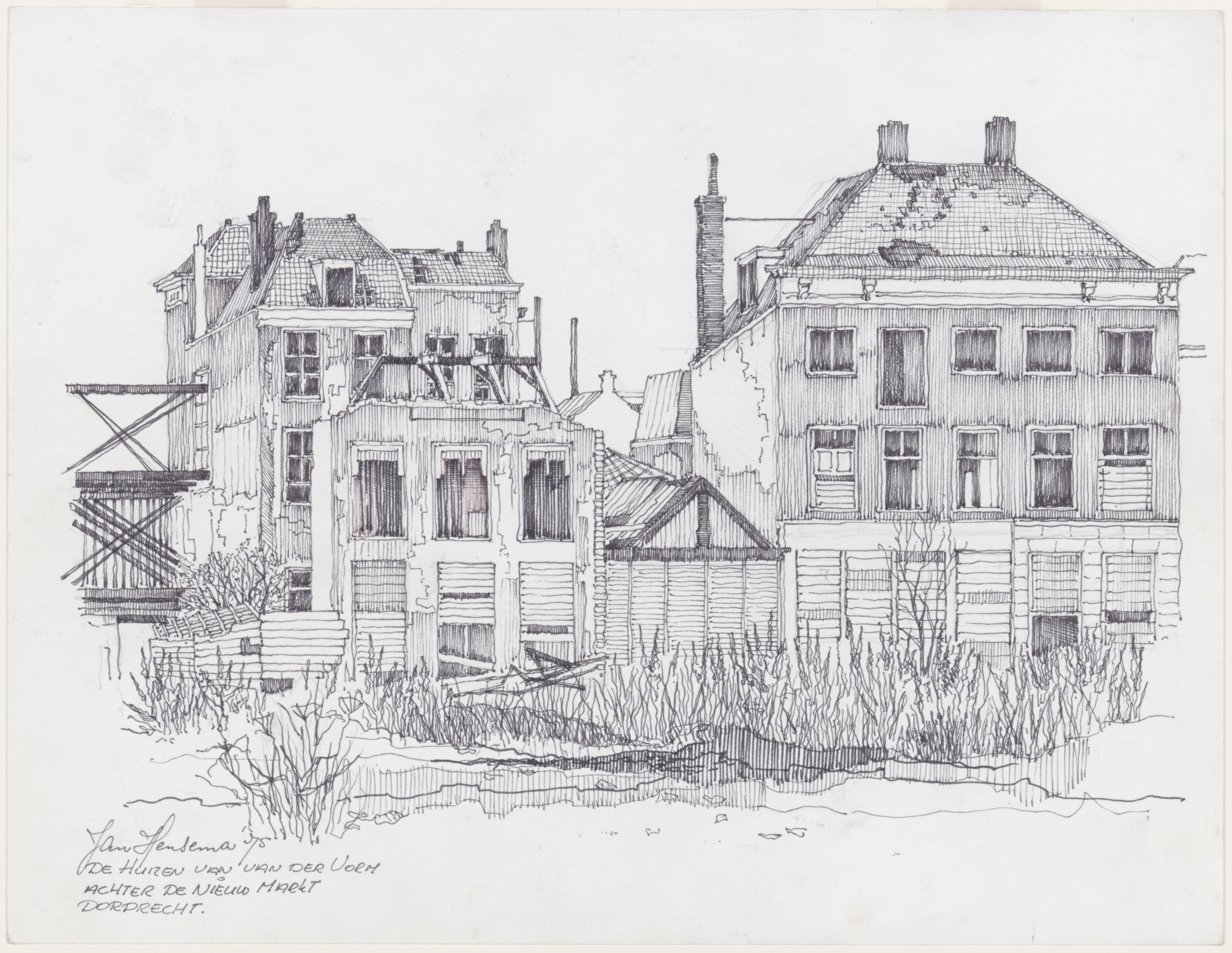 Tekening door Jan Hensema van de achterkant van huizen aan de Groenmarkt.