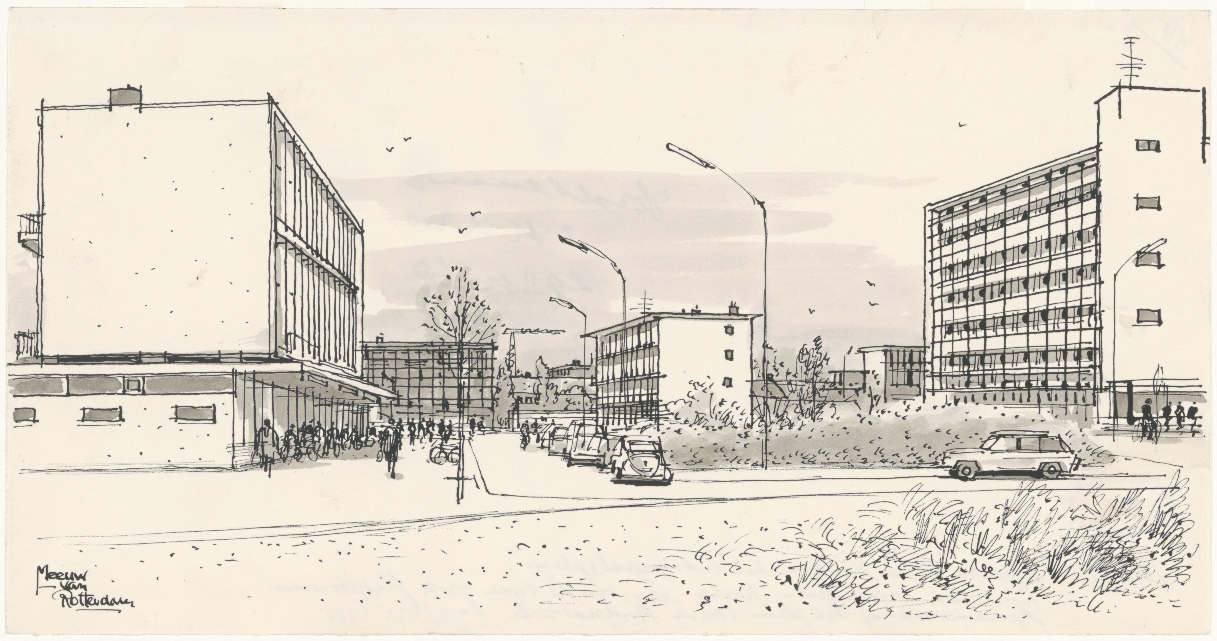 De flat uiterst rechts is de oostelijke flat van de Koophoek, de westelijke valt dus buitenbeeld inclusief de winkels van de Koophoek. De flat links vooraan is de flat parallel aan de Cornelis Trompplaats en staat aan het Admiraalsplein. Het 'groen' op de voorgrond lag om de vijver gelegen tussen laatst genoemde flat en de Andreaskerk. Daar heb je nu het "Waterwiel". Meeuw van Rotterdam heeft veel getekend voor het dagblad De Dordtenaar.
