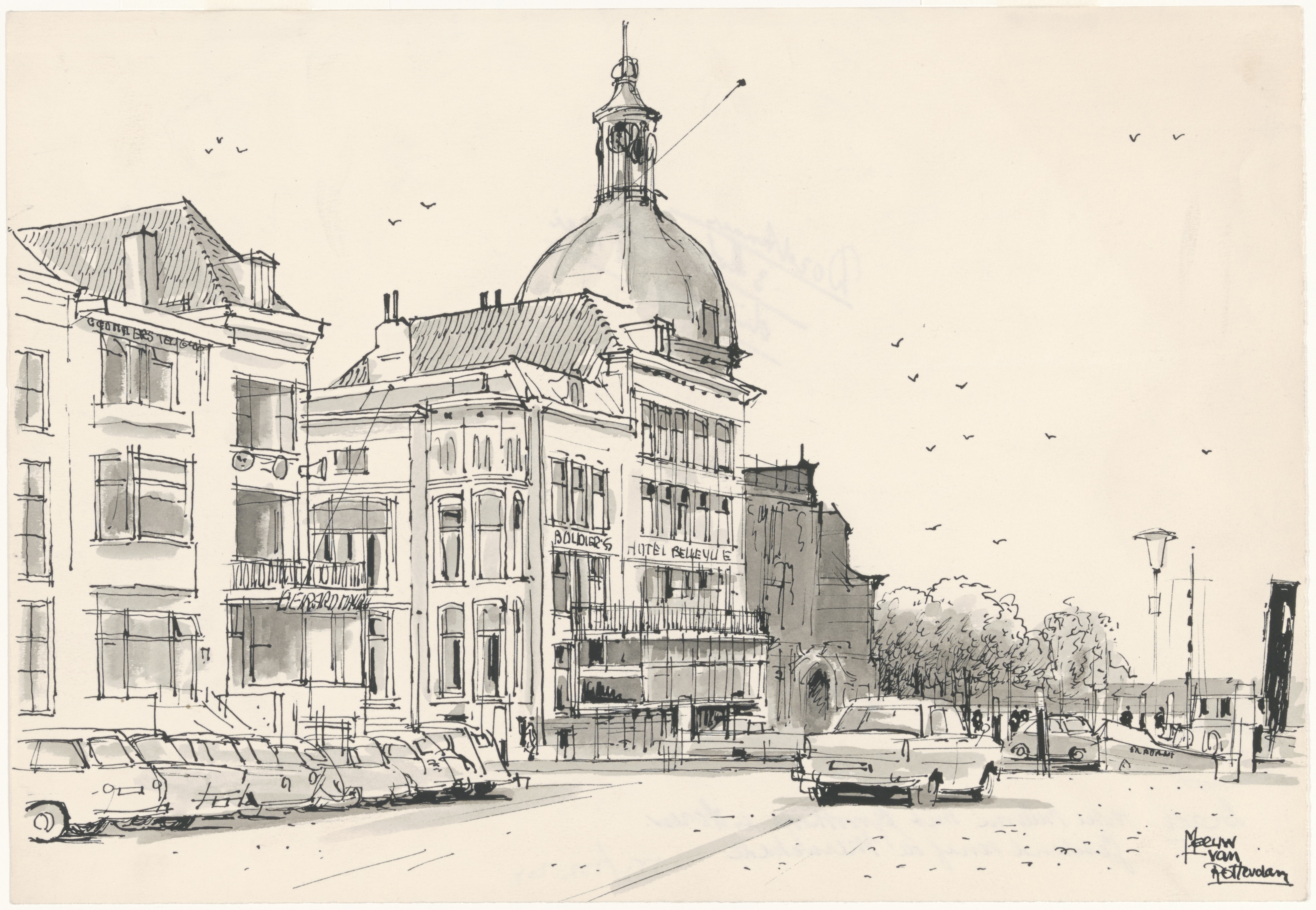Tekening door Meeuw van Rotterdam van de Merwekade met zicht op Hotel Bellevue en de …
