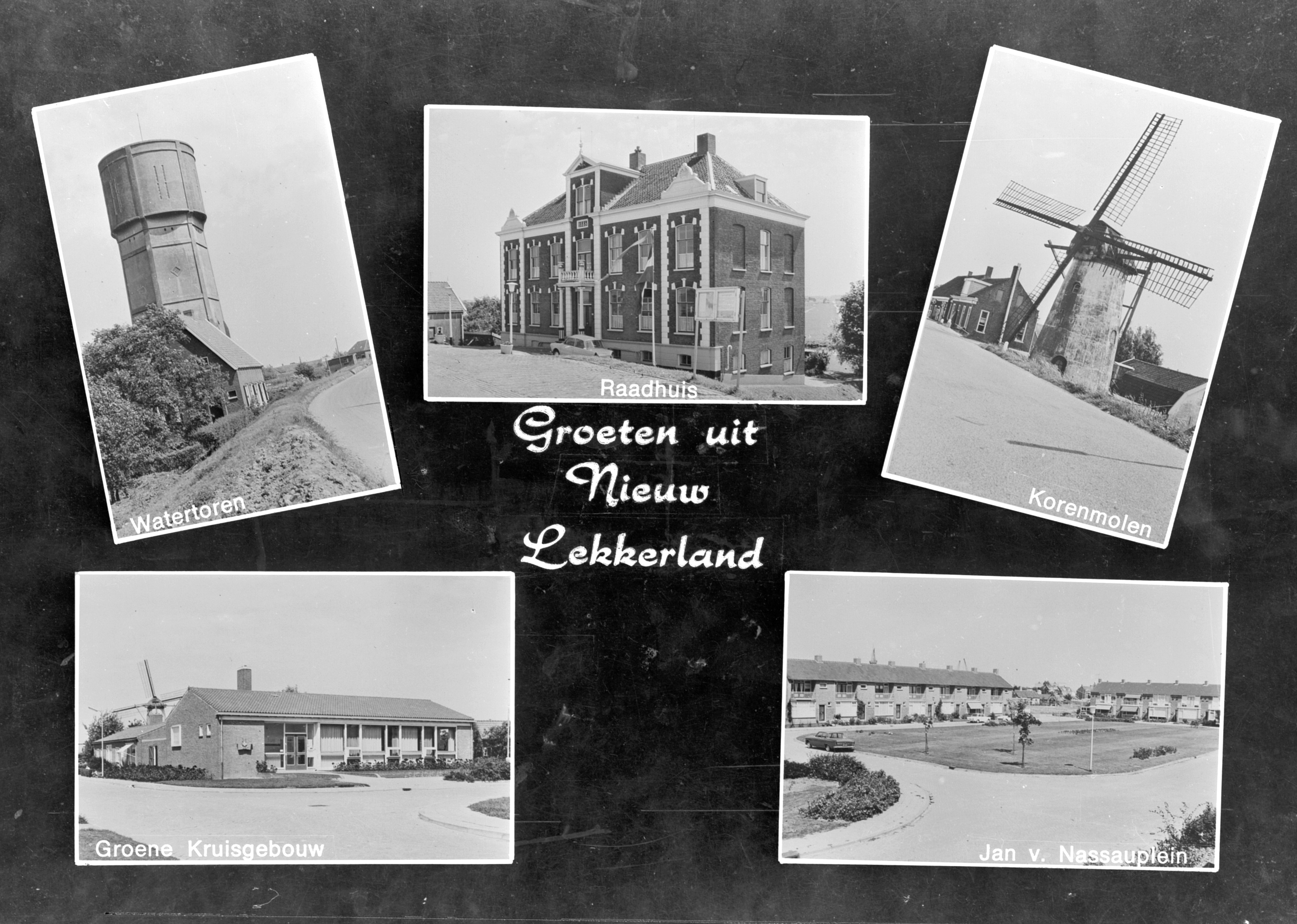 - Groeten uit Nieuw Lekkerland met de Watertoren, Raadhuis, Korenmolen, Groene Kruisgebouw en de Jan van Nassauplein