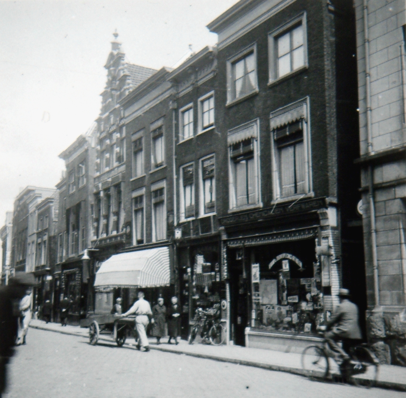 - Oostelijke zijde van de Voorstraat met bedrijfspanden en woningen vanaf Zakkendragersstraat (rechts naast de fietser) richting H.H. Suysstraat. V.l.n.r. nummer 124 (met zonnekap)banketbakkerij De Graaf, nr. 126 sigarenzaak van Langendoen en nr. 128drogisterij Zadoks.