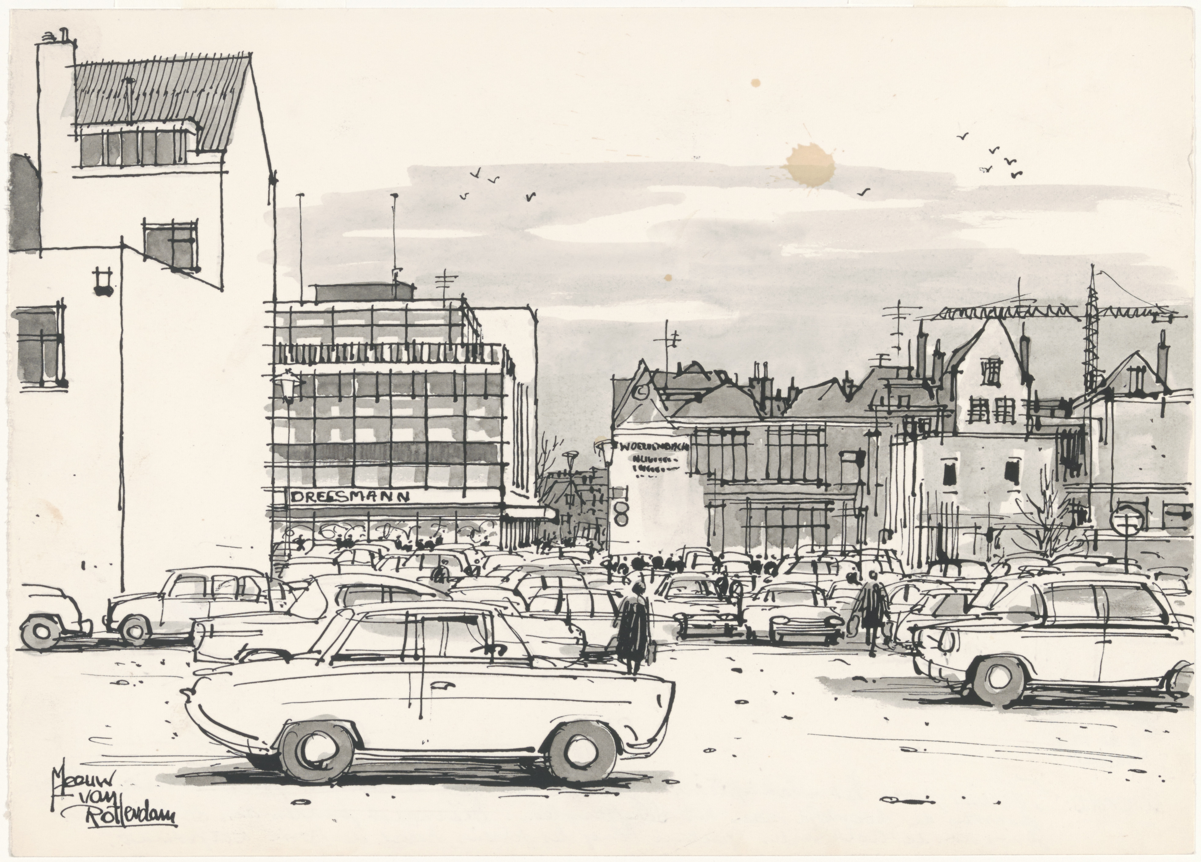 Tekening door Meeuw van Rotterdam van het parkeerterrein op het Statenplein. In het …