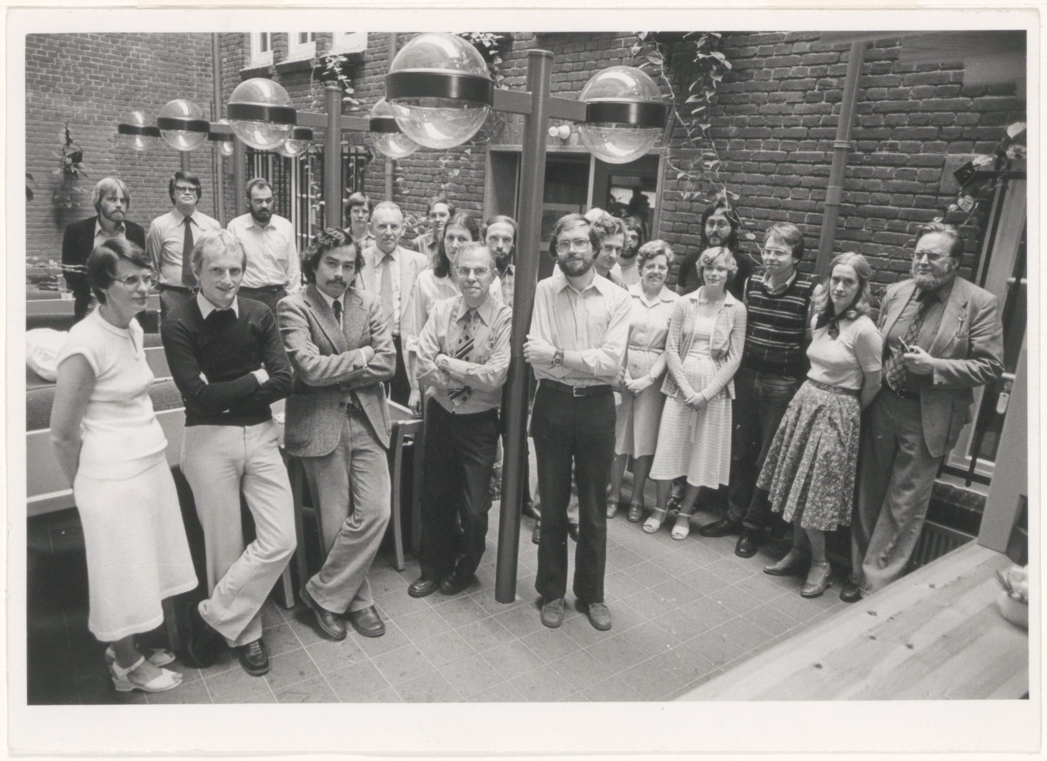 - Pesoneel in de kantine van het archief aan het Stek (later de studiezaal) ter gelegenheid van het afscheid van Peter Horsman, die op 1 september 1981 vertrok naar de Rijksarchiefschool. Op de voorste rij mevrouw en de heer Horsman, Peter Schotel, Luuk van den Hout en Riny Benschop. De rij daarachter Jelle Nauta, Mieke Jansen, Jan Joke Bientjes, J.G.A. Mulders ? (stagiair), Ad van der Aa ?, Jannie van den Berg, Ingeborg van Vliet (stagiaire) met achter haar Henk 't Jong, Sjaak de Jonge en mevrouw en de heer Th. Jensma (archivaris).