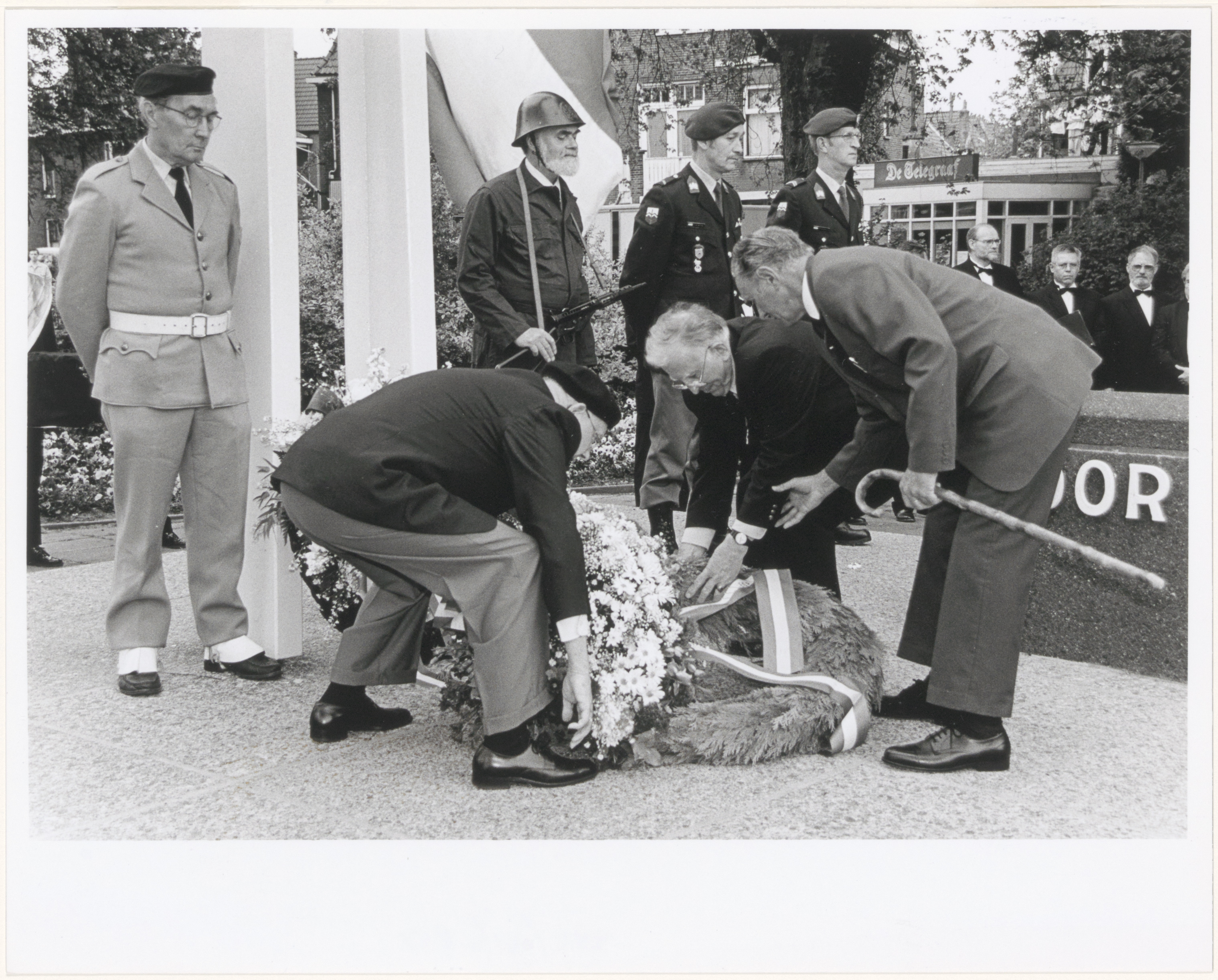 - Kranslegging tijdens de dodenherdenking op het Sumatraplein. Op de voorgrond Kees de Mol, Piet de Vlaming (met stok) en Henk Brand. Daarachter v.l.n.r. Joop van Helden, Piet Heuseveldt en twee leden van de Nationale Reserve.