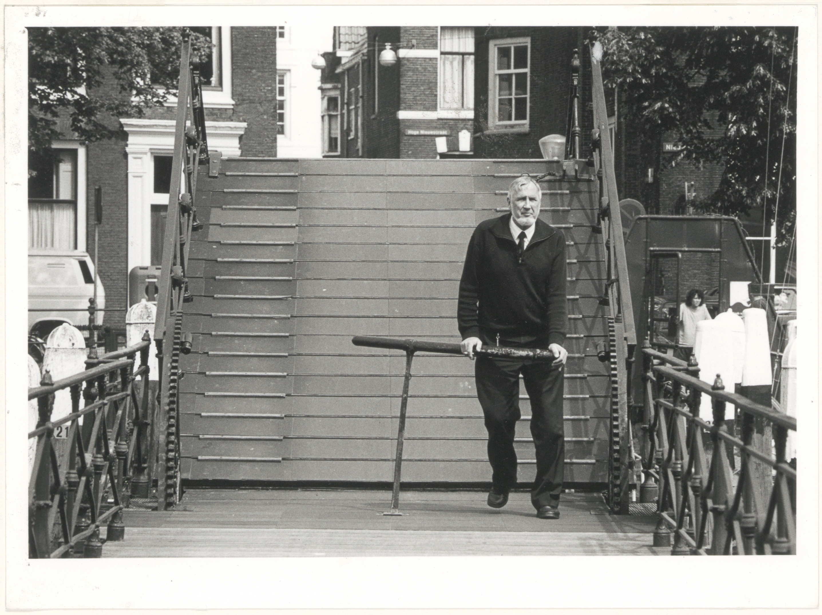 De brugwachter bedient de Lange IJzerenbrug over de Nieuwe Haven. Achter hem de Lange IJzerenbrugstraat.