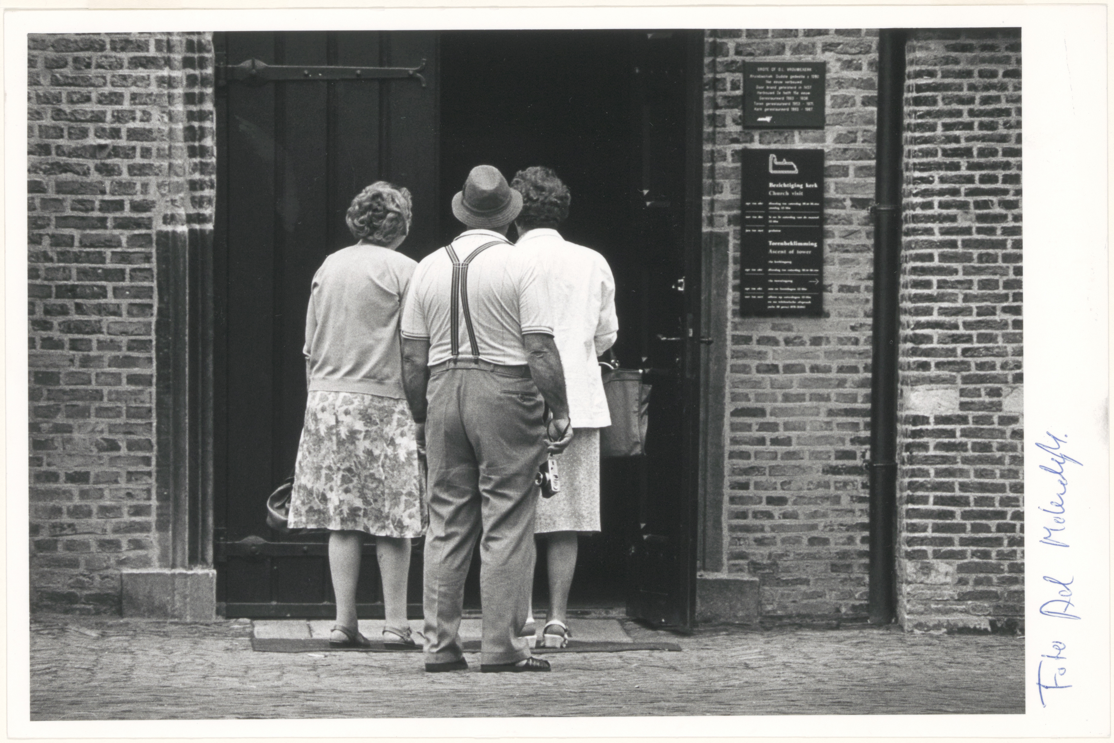 - Bezoekers aan de Grote Kerk bij de ingang aan het Grotekerksplein.