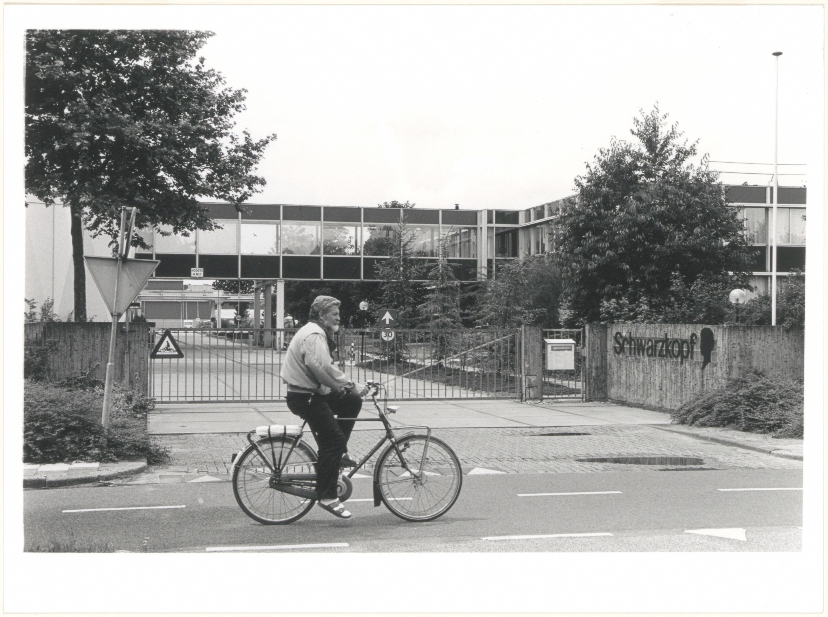 Een fietser passeert de vestiging van Schwarzkopf aan de Rijksstraatweg.