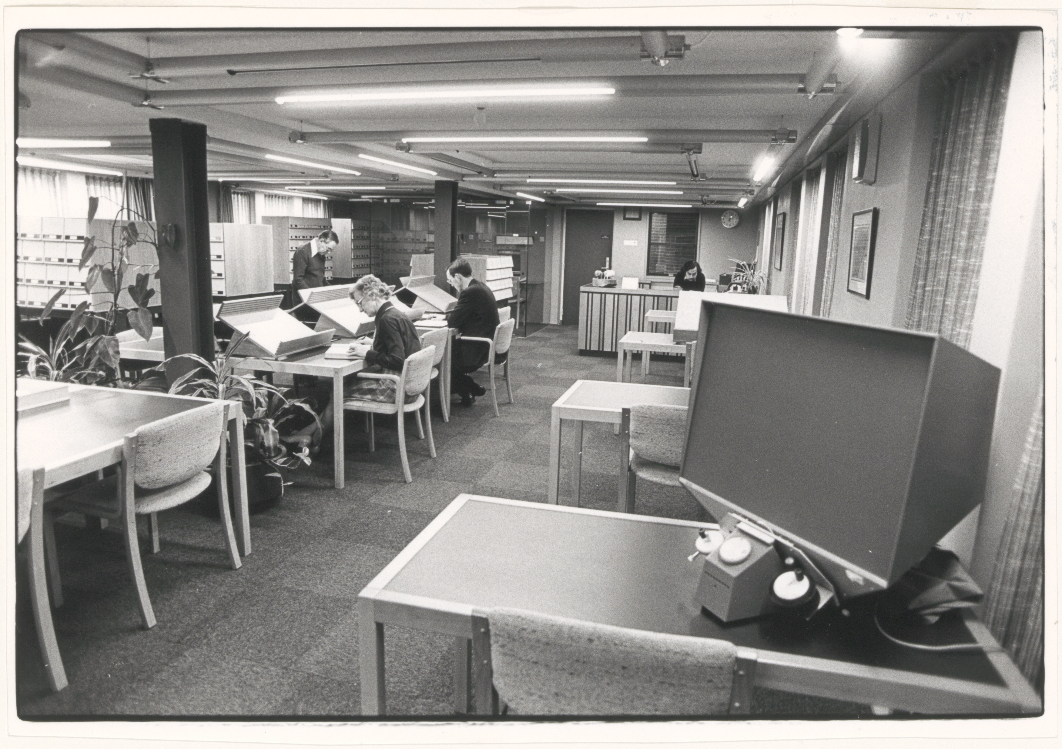 - De studiezaal (ook wel leeskamer genoemd) van de Gemeentelijke Archiefdienst Dordrecht op de eerste etage van het in 1977 vernieuwde gebouw aan het Stek. Achter de balie drs. Peter Schotel en als ‘bezoekers’ de archiefmedewerkers Adri de Jong, Piet Bos en, staande achter een tafel, restaurator Luuk van den Hout. Het luik achter de balie diende om archiefstukken die vanuit de depots werden aangevoerd door te geven naar de studiezaalambtenaar. De studiezaal verhuisde later naar de begane grond.