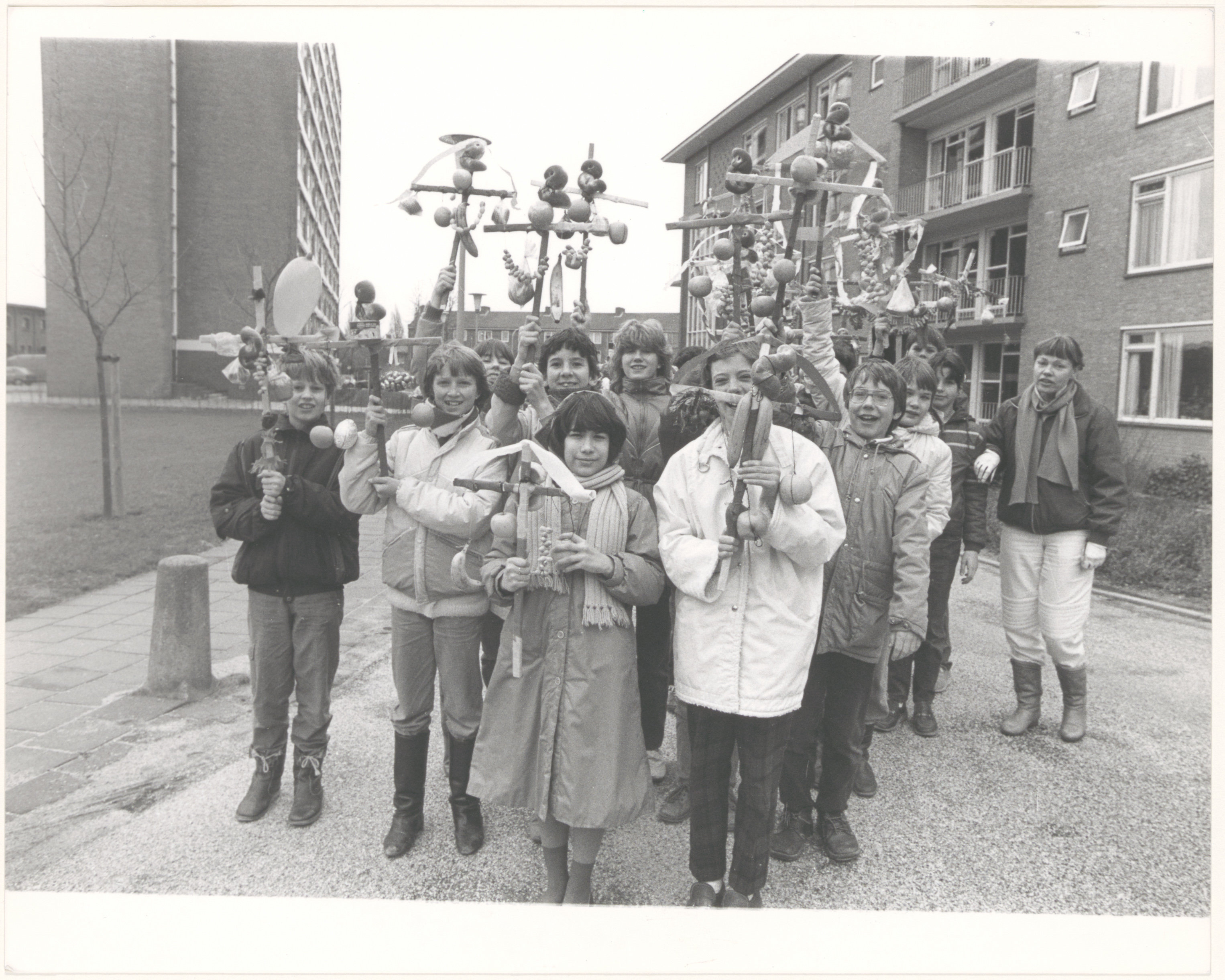 - Schoolkinderen met palmpasenstokken bij bejaardencentrum Thureborgh aan de Mauritsweg.