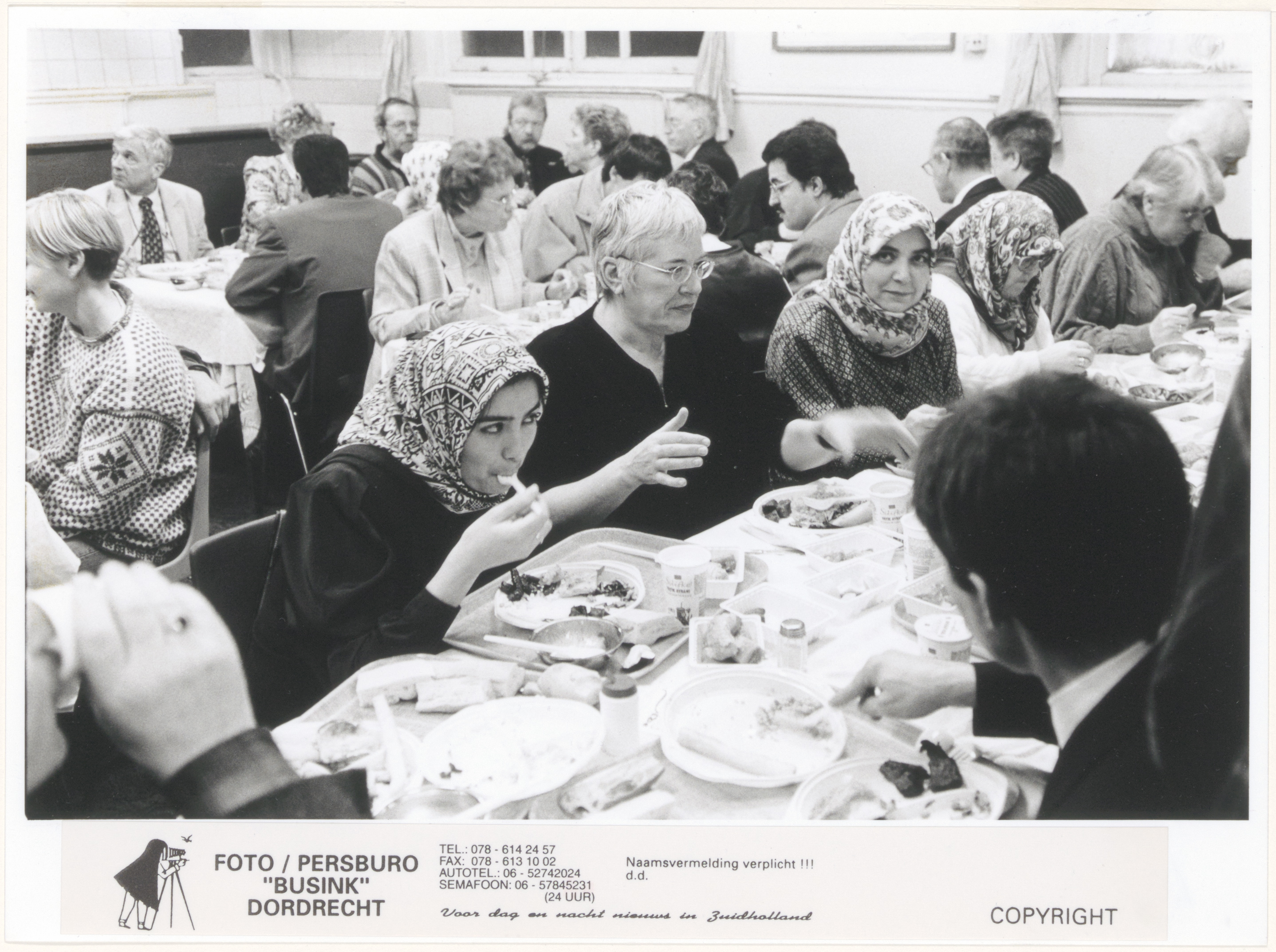 (foto persburo Busink) maaltijd (kantine), etende mensen (plastic borden, vrouwen met hoofddoek)