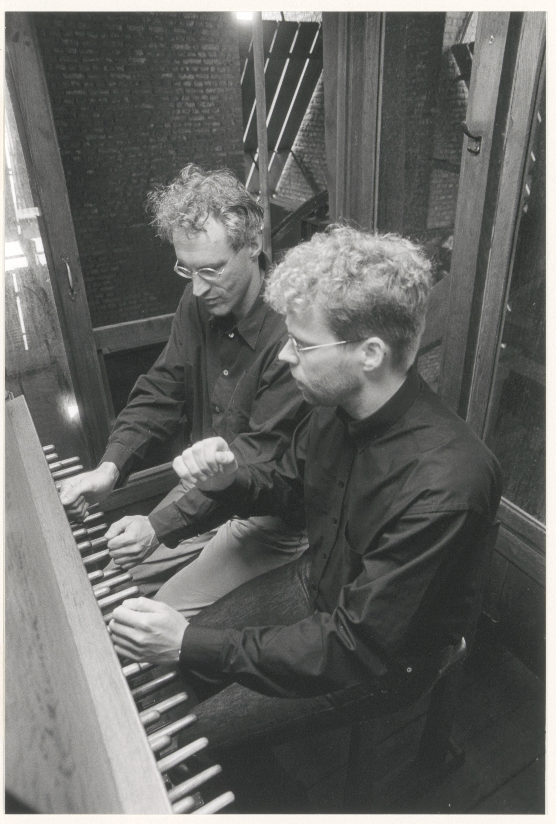 - De beiaardiers Henry Groen (links) en Boudewijn Zwart op het carillon van de Grote Kerk.