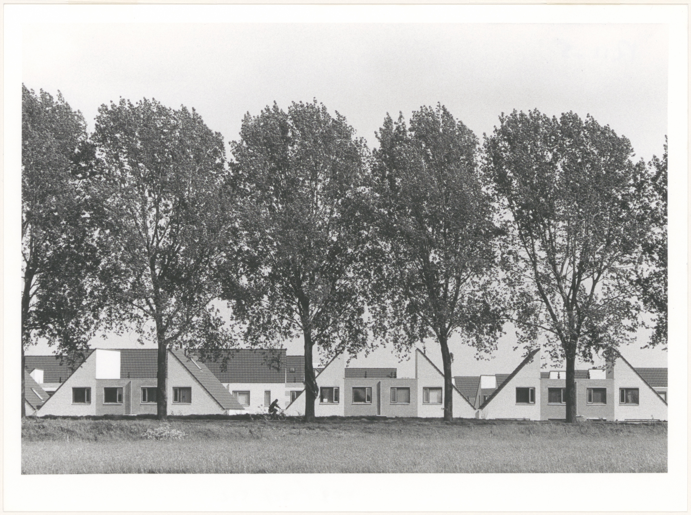 - Een fietser op de Loswalweg langs de huizen op het Van Doesburg-Erf, gezien vanaf de Macoré.