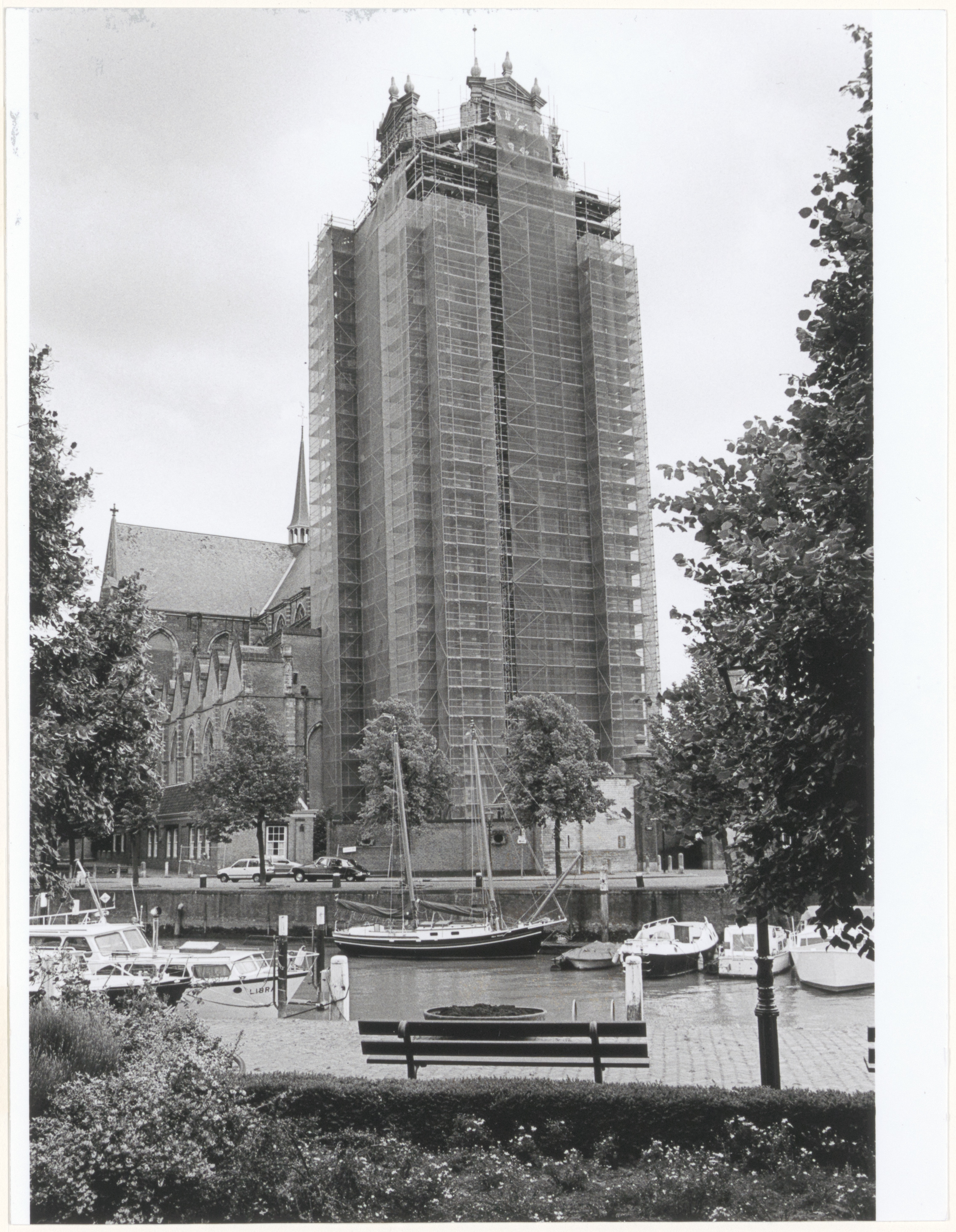 - De toren van de Grote Kerk in de steigers, gezien vanaf het Maartensgat.