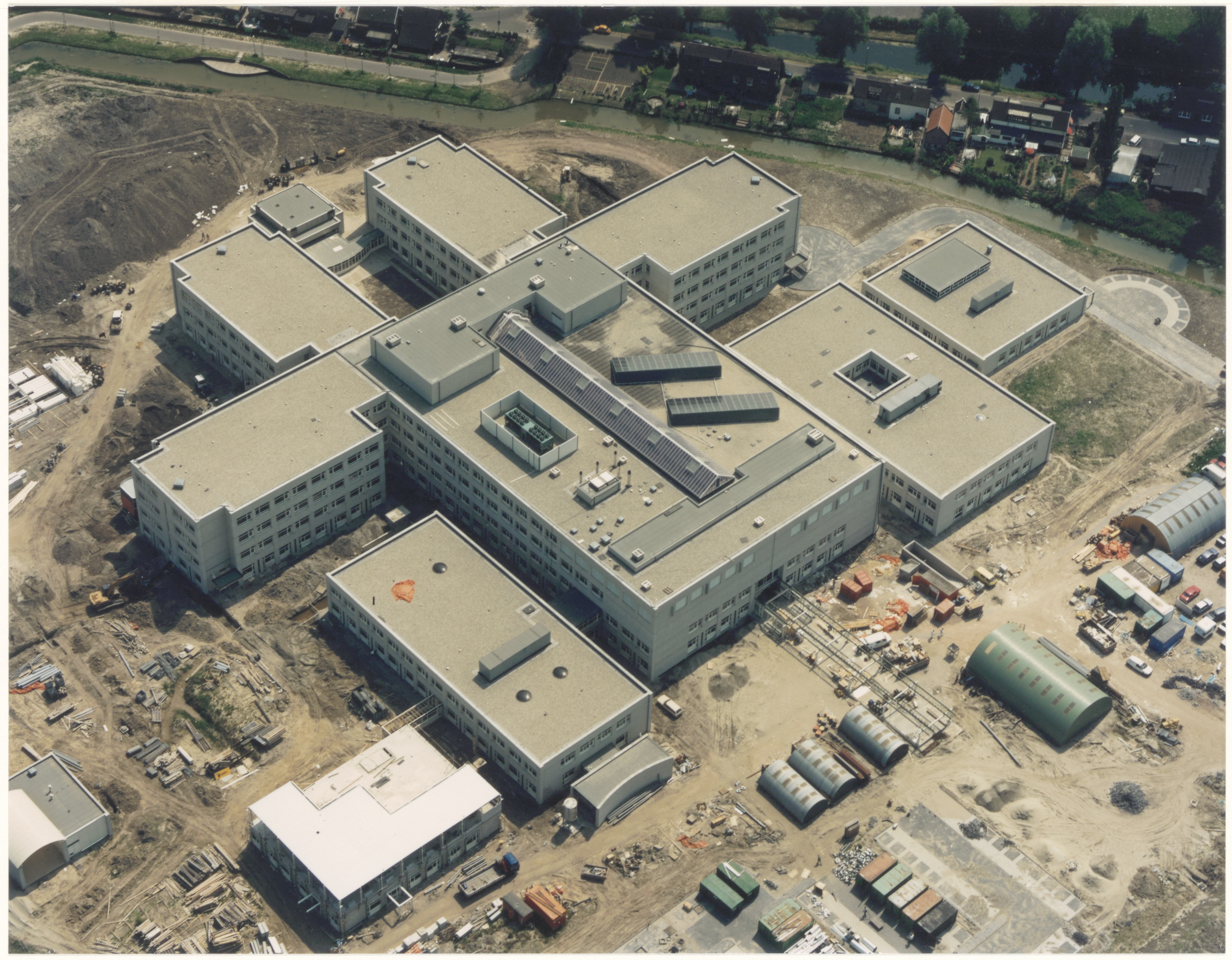 Luchtfoto van de bouw van het Albert Schweitzerziekenhuis aan de Karel Lotsyweg. Op de …