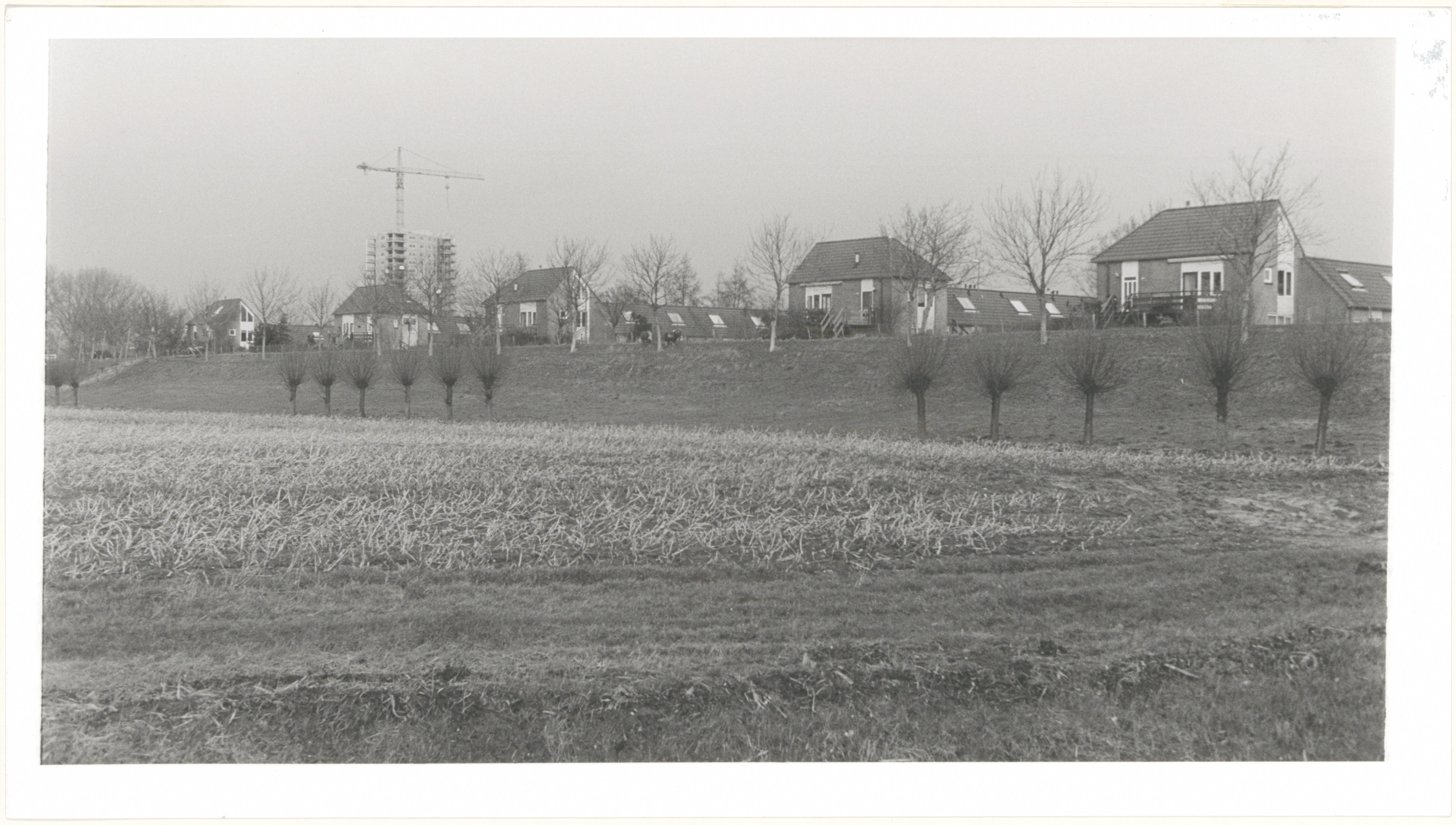 Noordendijk en woningen aan het Suze Groeneweg-erf vanaf de Recklinghausenweg naar de in aanbouw zijnde Sequoia-flat aan het Van Eesterenplein gezien.