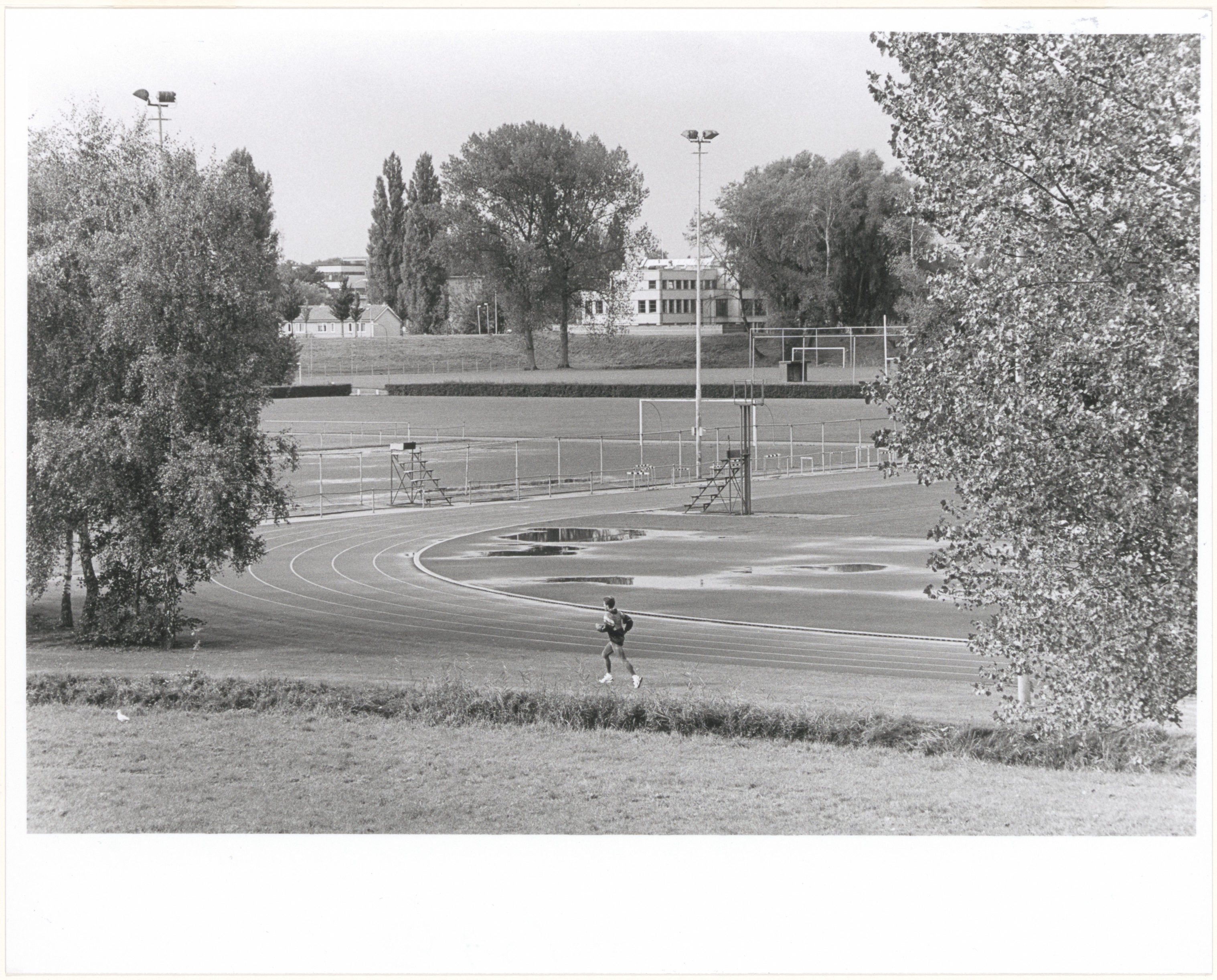 Atletiekbaan in de Windhondpolder, gezien vanaf de Wantijdijk in de richting van …