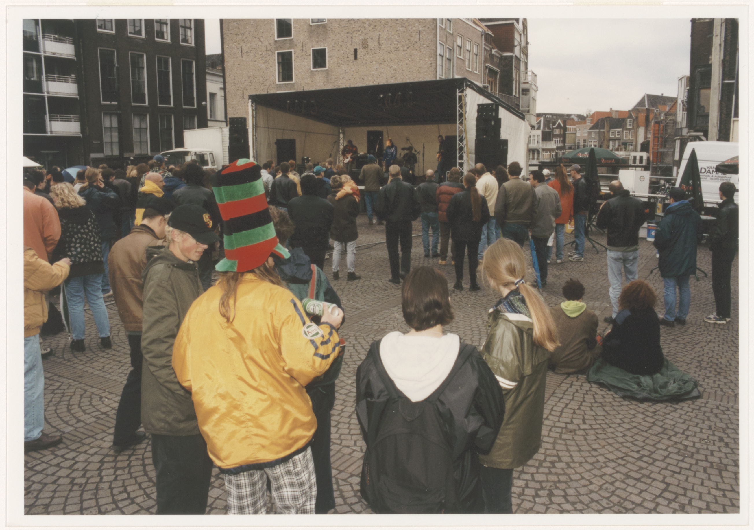 - Podium met muzikanten op het Scheffersplein. Links de Wijnstraat, rechts de Voorstraat.