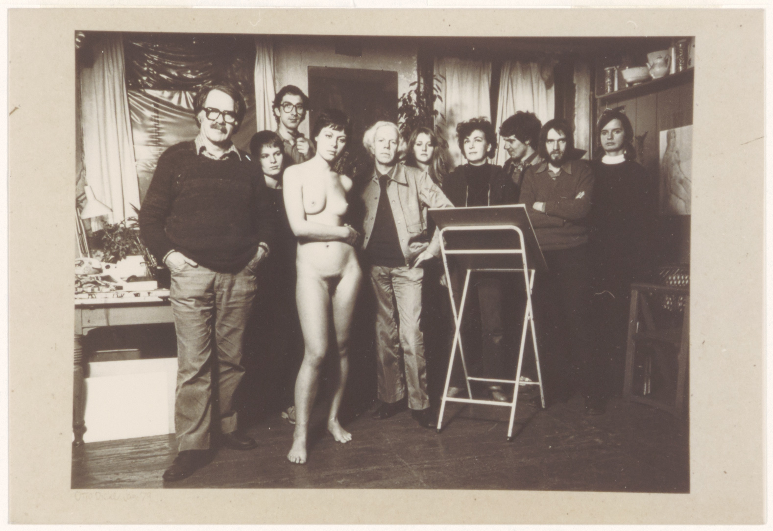Van links naar rechts: Otto Dicke, nn, Theun Okkerse, het model JA, Philip Kouwen, .. Claessen, Monique Polak, Robert Duyf, Arie Wolst, nn. Otto draaide barok muziek tijdens die avonden. Hij was buitengewoon gastvrij. Er werd altijd bijzonder hard gewerkt.
