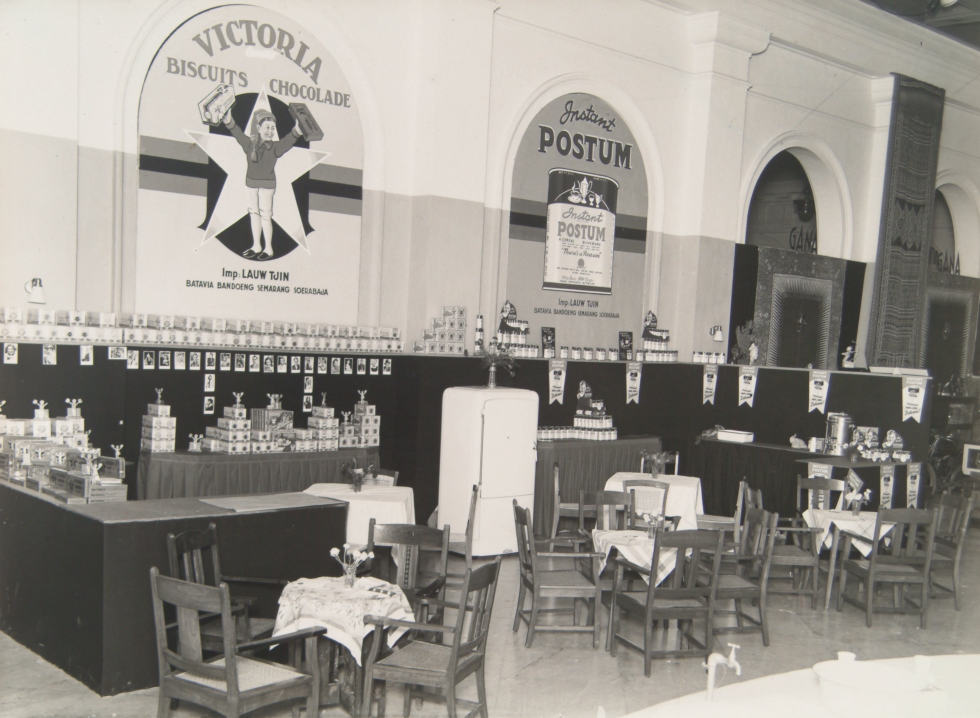 Reclamestand van de Chocolade- en biscuitfabriek Victoria in Batavia