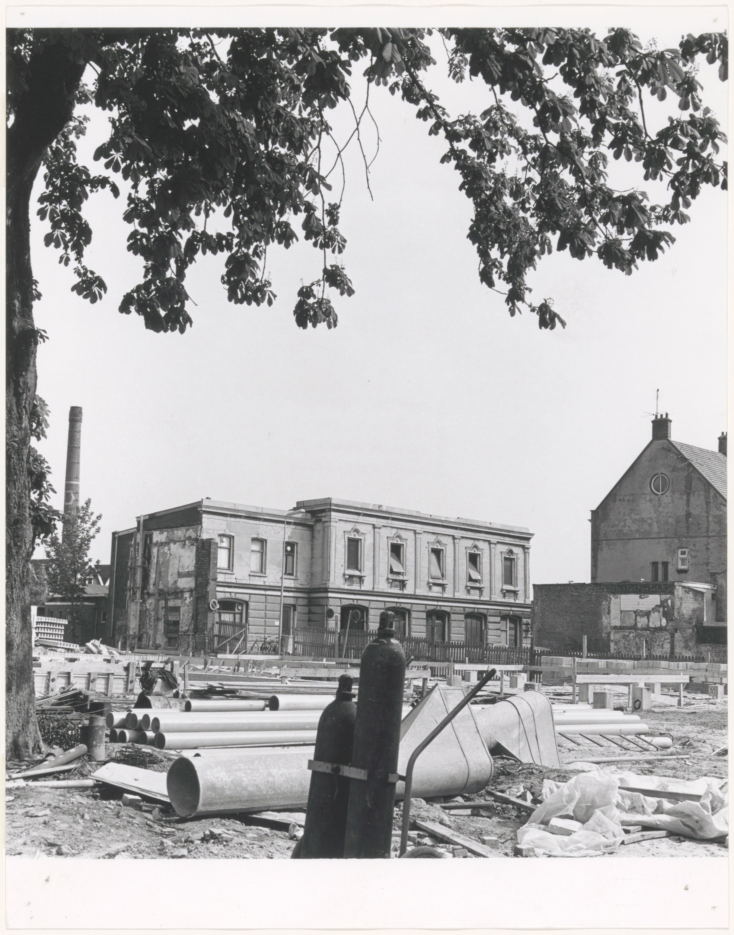 - Saneringsgebied Vest / Stekstraat. Links de schoorsteen van DMI aan het Kromhout, rechts de manege op de hoek van de Stekstraat.