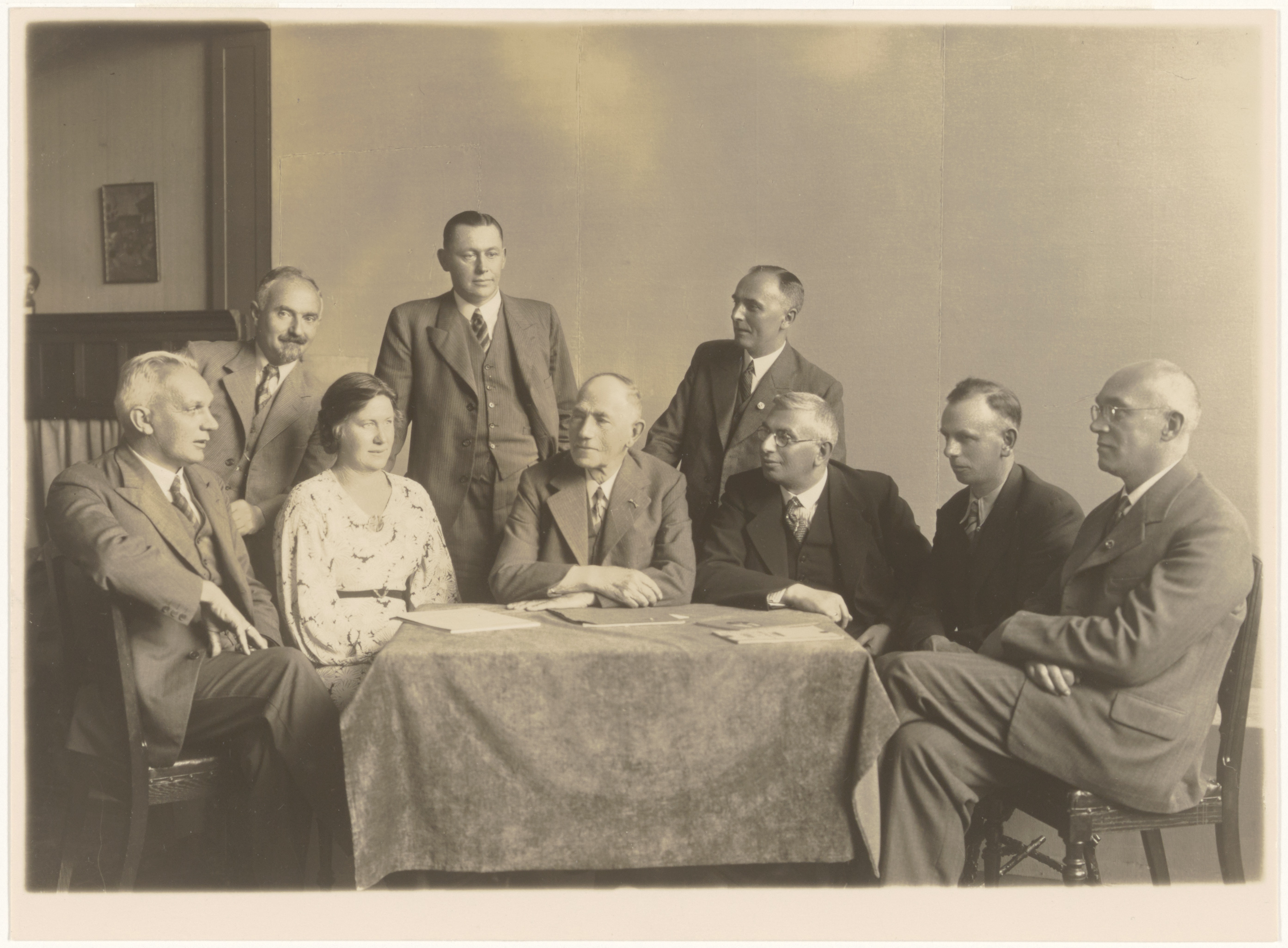 - De bouwcommissie van de gemeente Dordrecht. V.l.n.r. A. Versteeg, Mevr. Smit-Pieters, Z. v. Schelt, Isidor van Huiden, H.J. v. Doremalen, Van Buren. Staand: Van Tilburg, Bleeker, J. Kunnen.