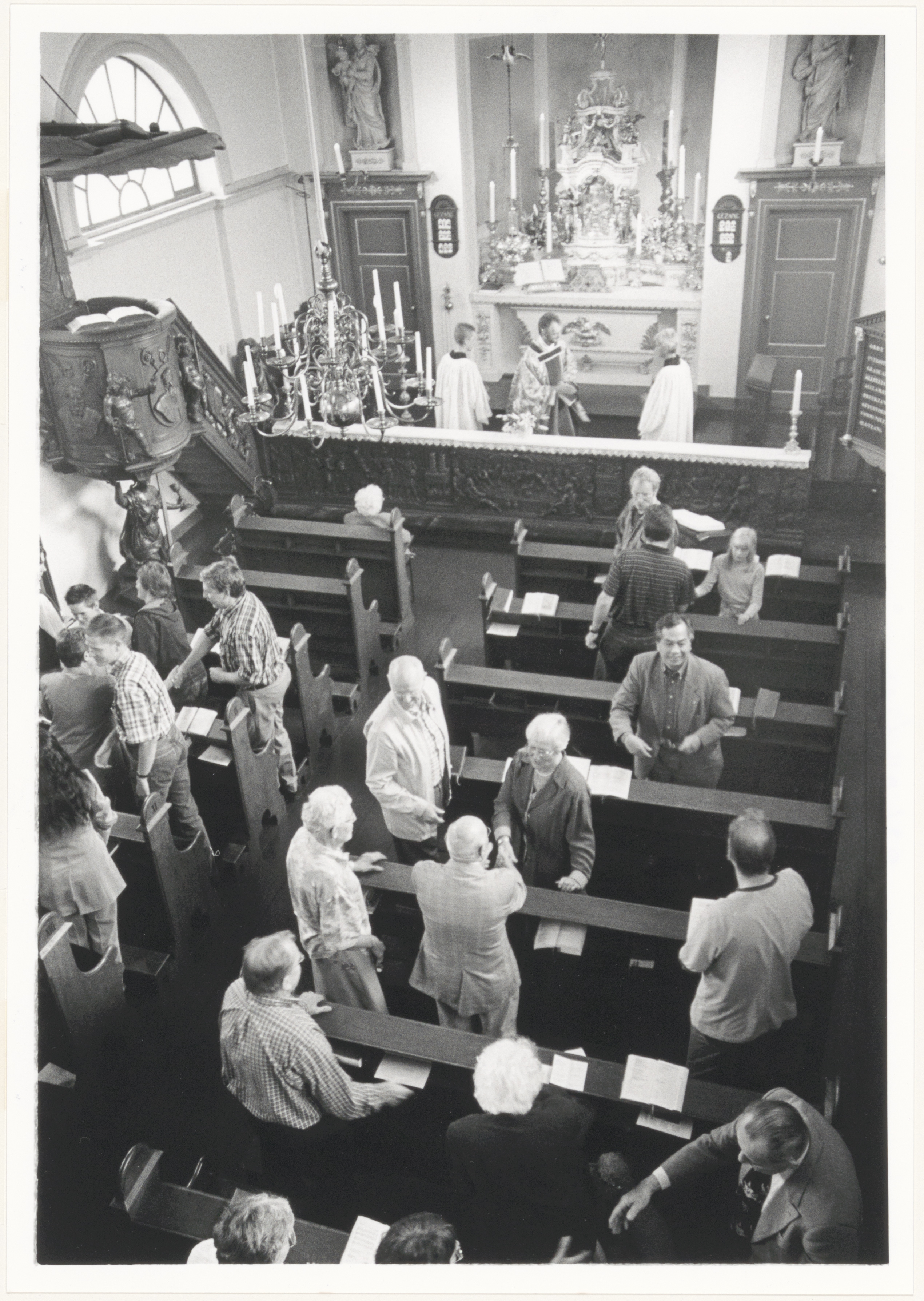 - kerkbanken kerkgangers kerkinterieurs kroonluchters