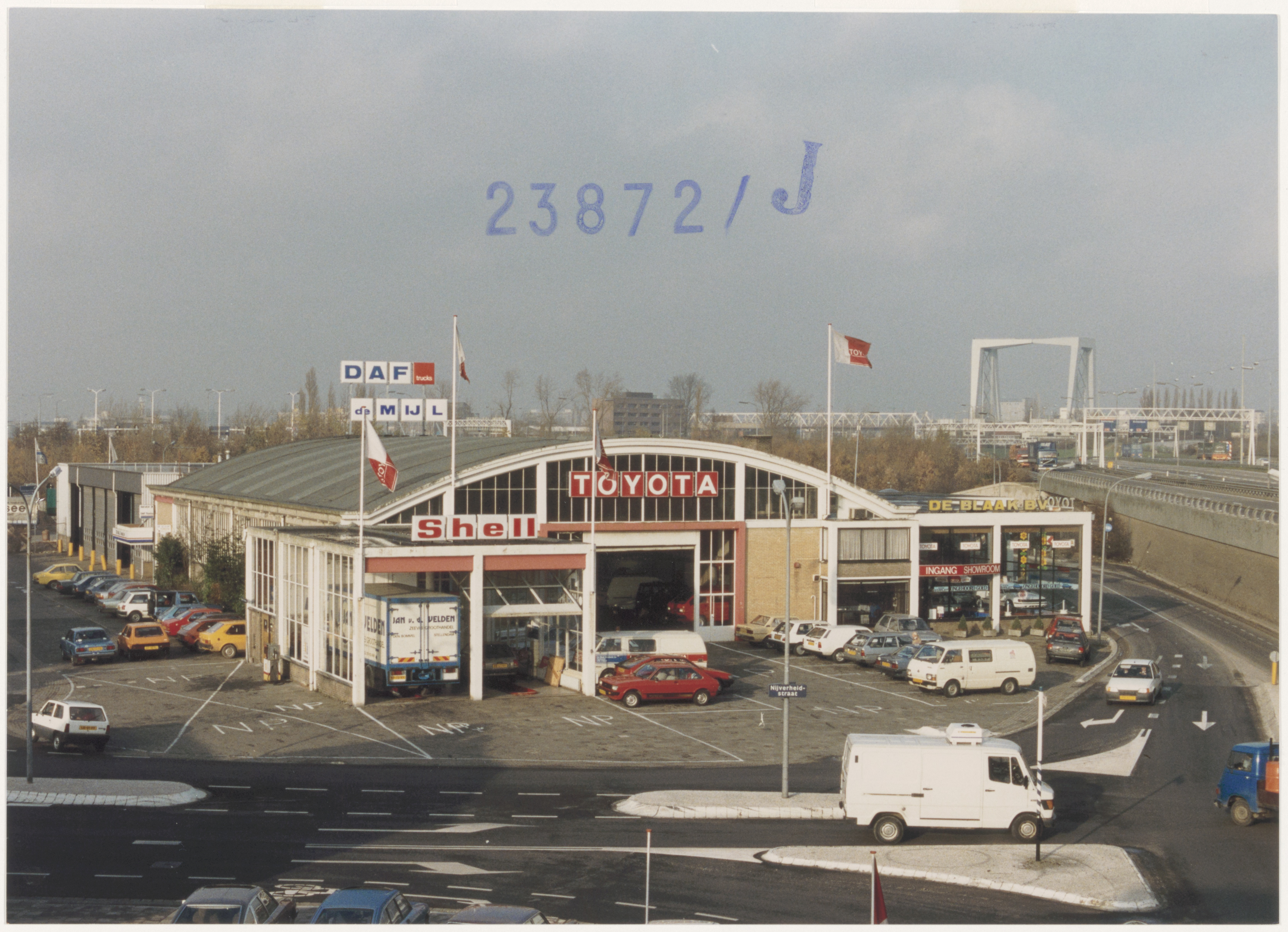 - Autobedrijven op de hoek Mijlweg (rechts), Nijverheidstraat (voorgrond) en Eerste Tolstraat (links). Op de achtergrond de bruggen over de Oude Maas.