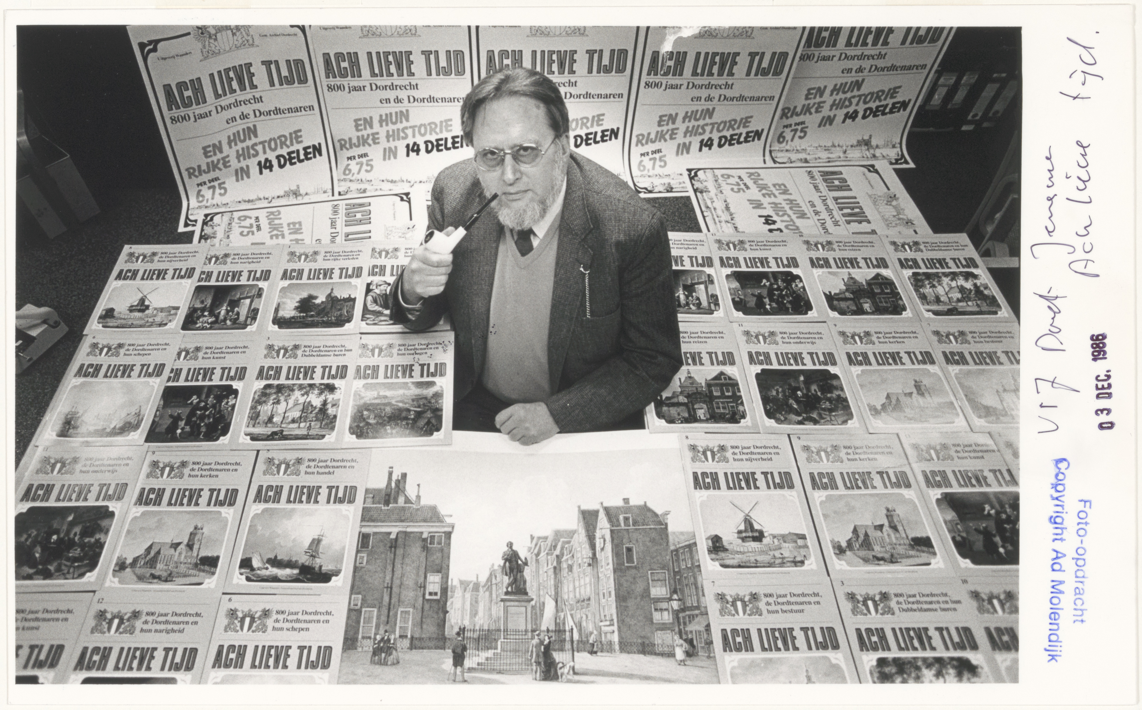 Gemeentearchivaris Theunis Watzes Jensma tussen de 14 afleveringen van de uiterst succesvolle serie ’Ach Lieve Tijd, 800 jaar Dordrecht en de Dordtenaren’, die in 1985 en 1986 werd uitgegeven door de Zwolse uitgeverij Waanders en de Gemeentelijke Archiefdienst Dordrecht.