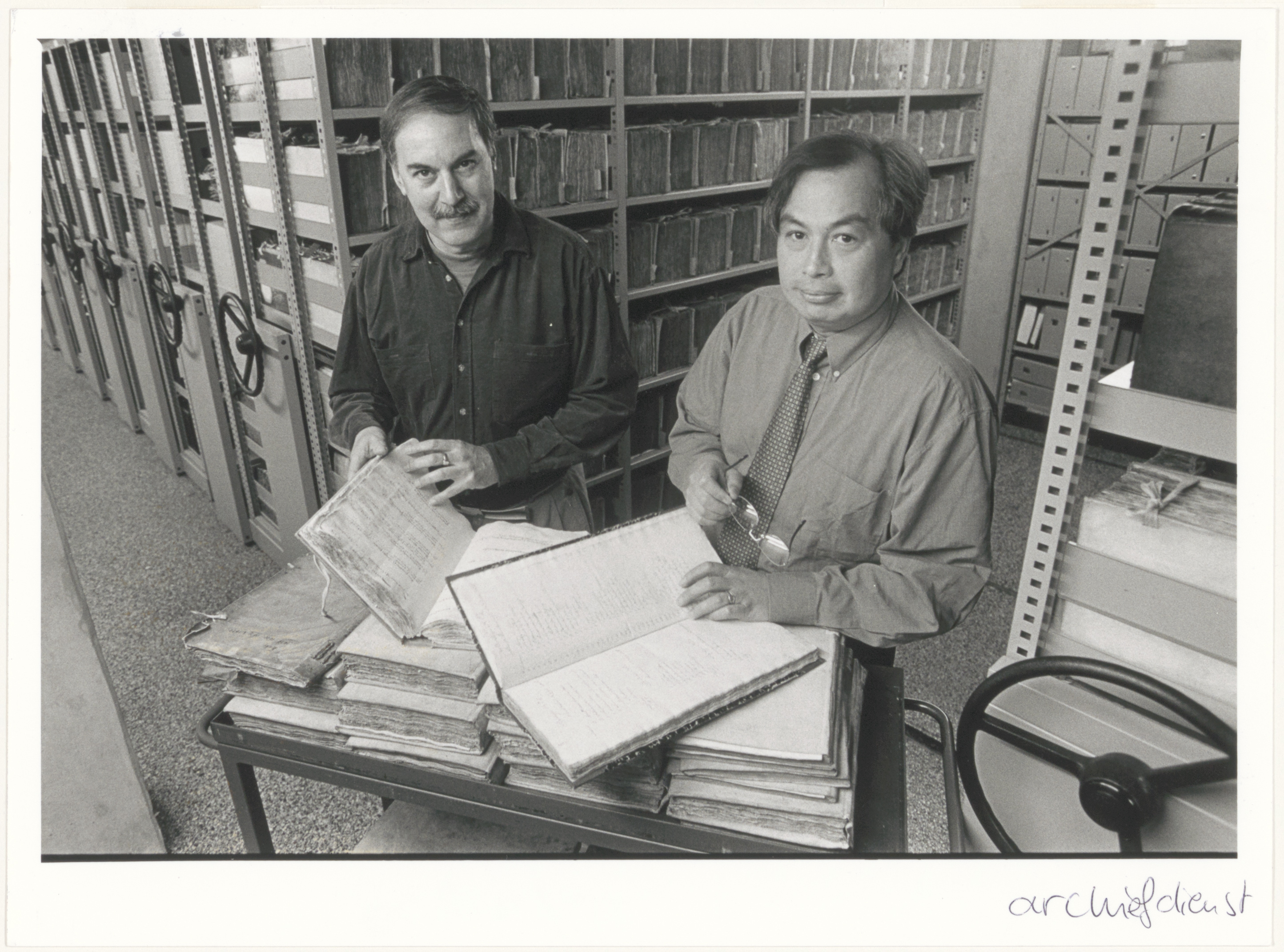 Archiefmedewerkers Emile Havers (links) en Peter Schotel met een kar vol archiefstukken in een van de depots van het Gemeentelijke Archiefdienst Dordrecht aan het Stek.