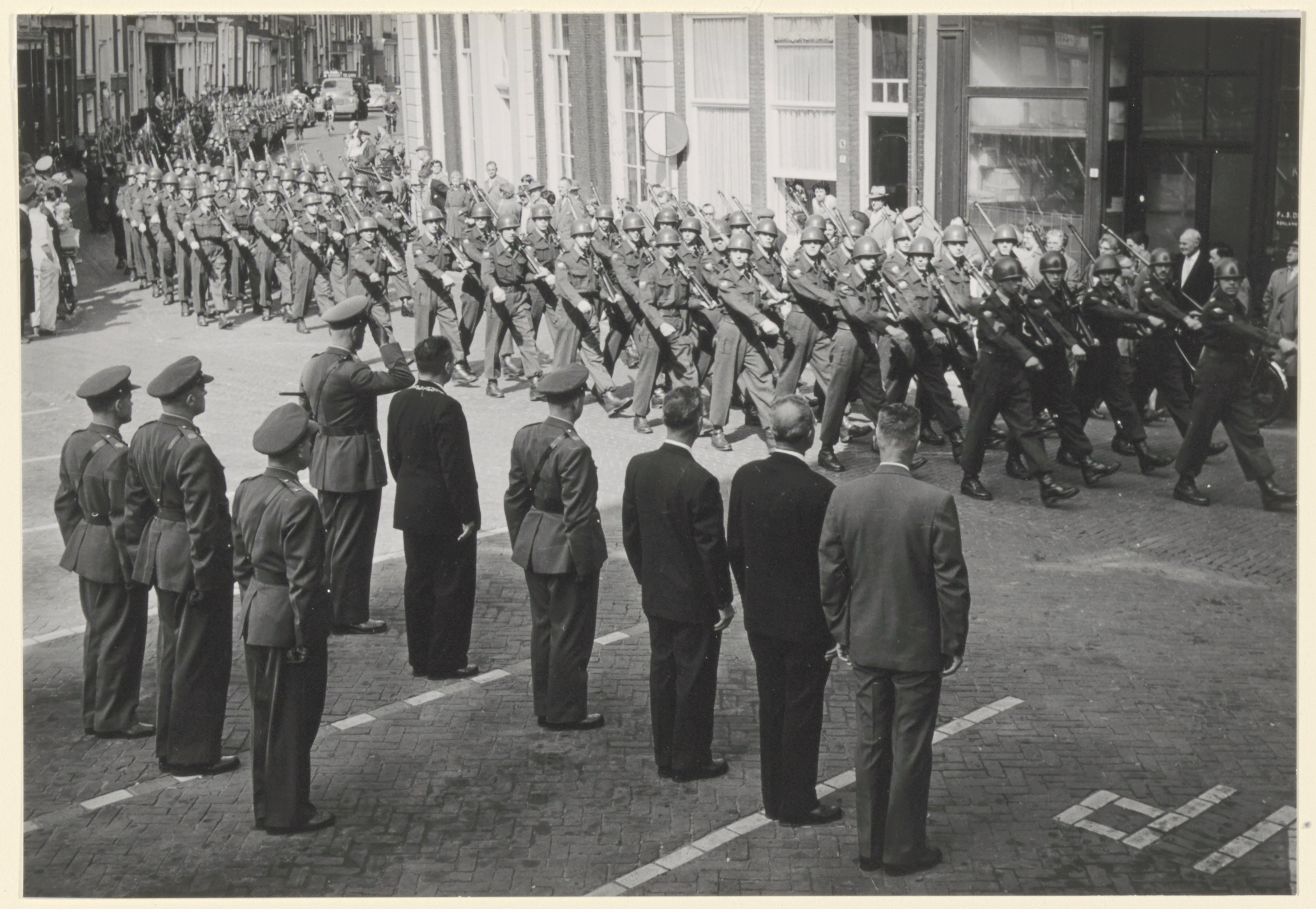 - Afscheidsdefilé van het Korps Pontonniers voor het stadhuis in aanwezigheid van burgemeester Van der Dussen.