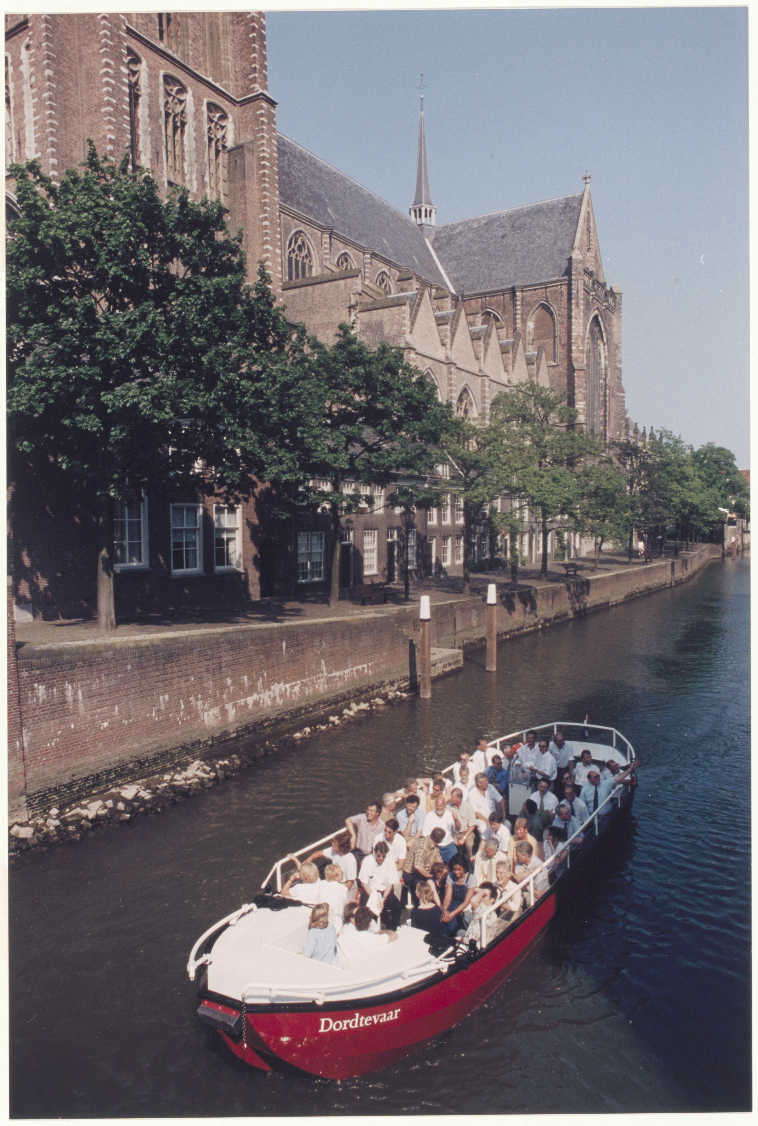 - Rondvaartboot Dordtevaar in de Voorstraatshaven passeert de Grote Kerk bij de Pottenkade.