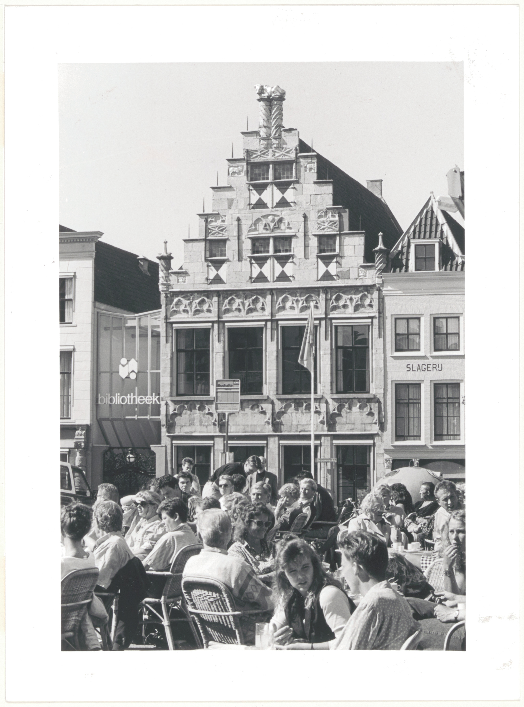 Vol terras op de Visbrug. Op de achtergrond de bibliotheek in huis De Vergulde Os en …