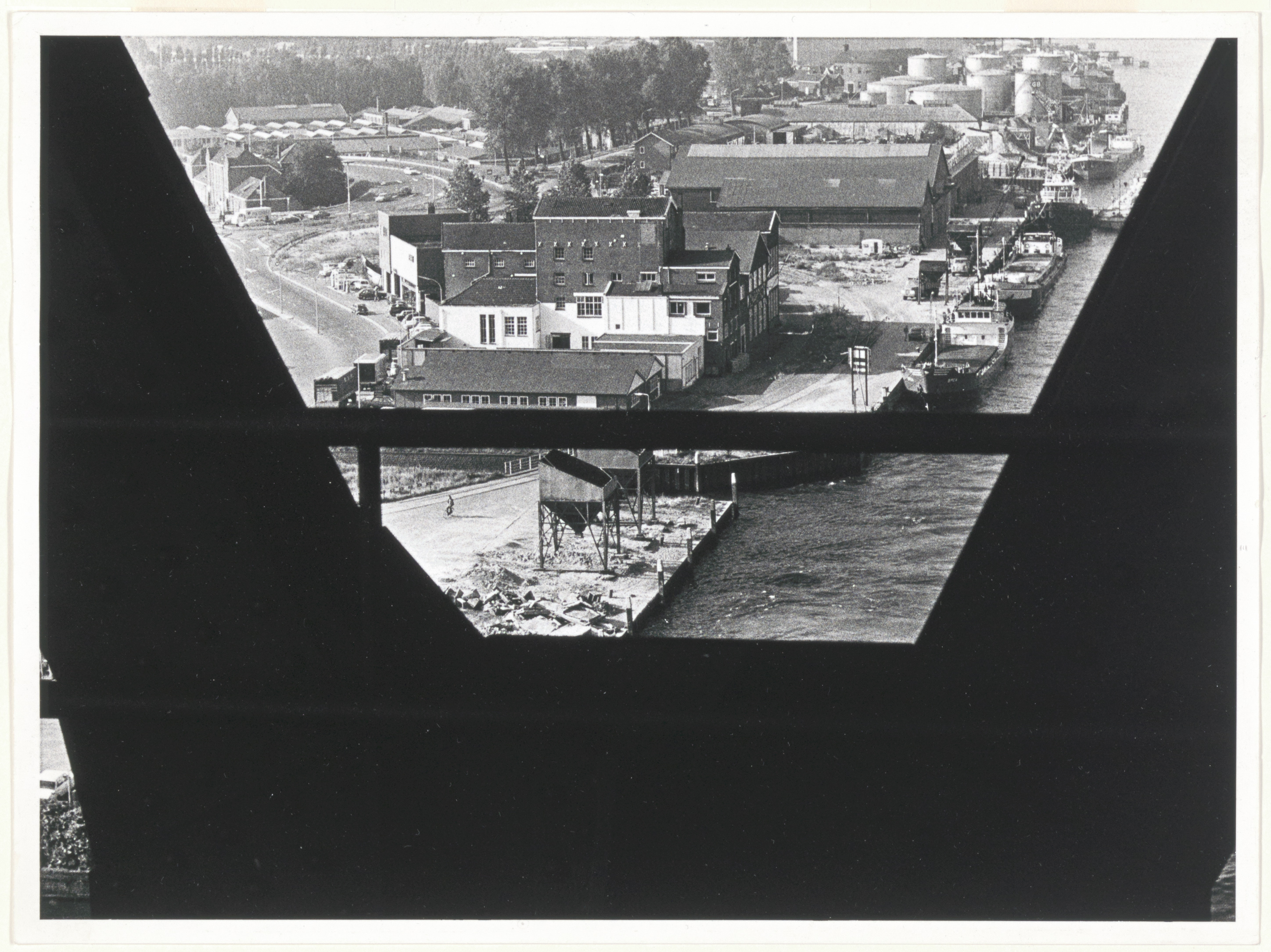- Gebied tussen 's-Gravendeelsedijk (links) en Handelskade langs de Oude Maas met de fabriek van Zwartkop en de opslagtanks van Gebroeders Broere, gezien vanaf de spoorbrug.