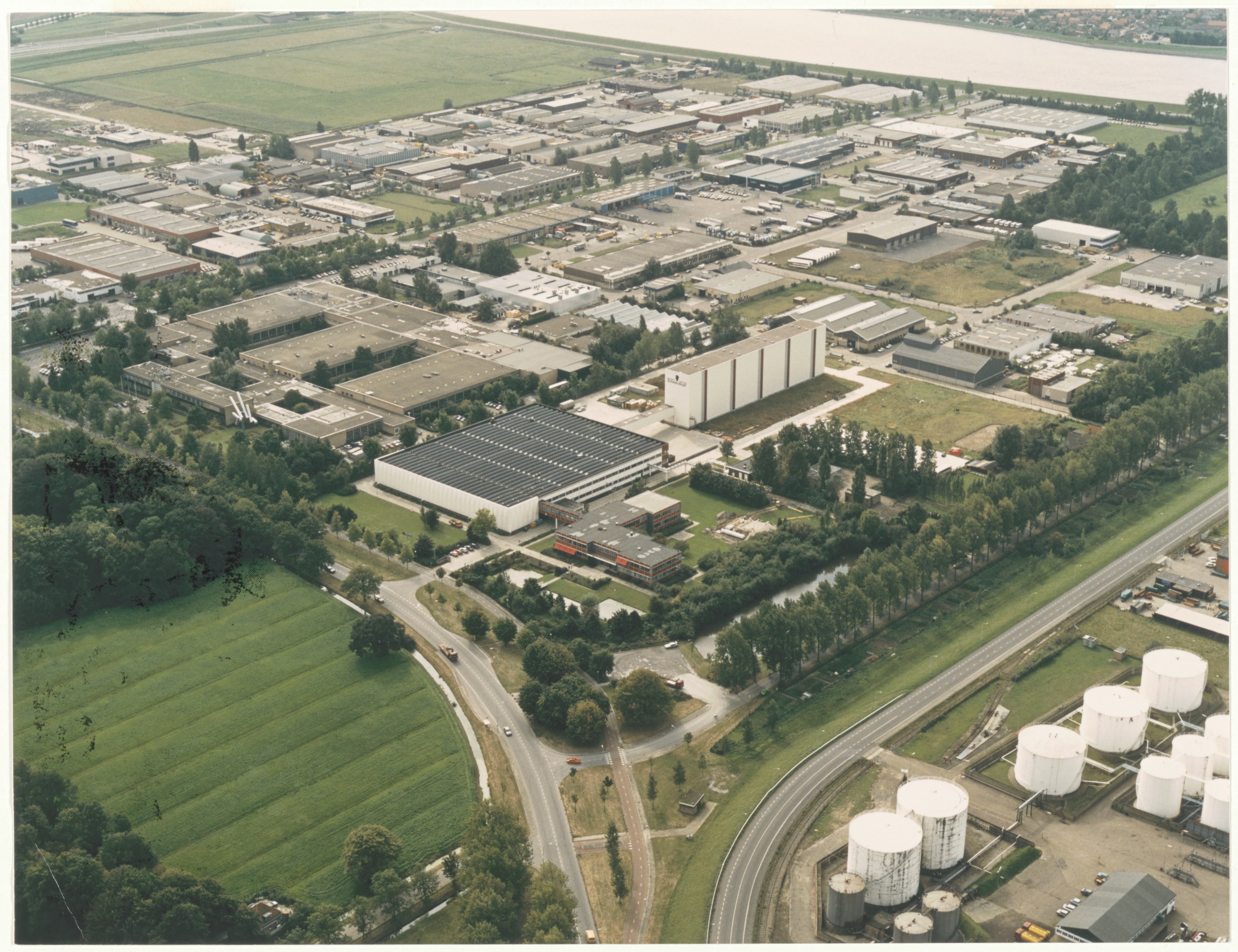Luchtfoto van bedrijventerrein langs de Rijksstraatweg. In het midden met zwart dak is …