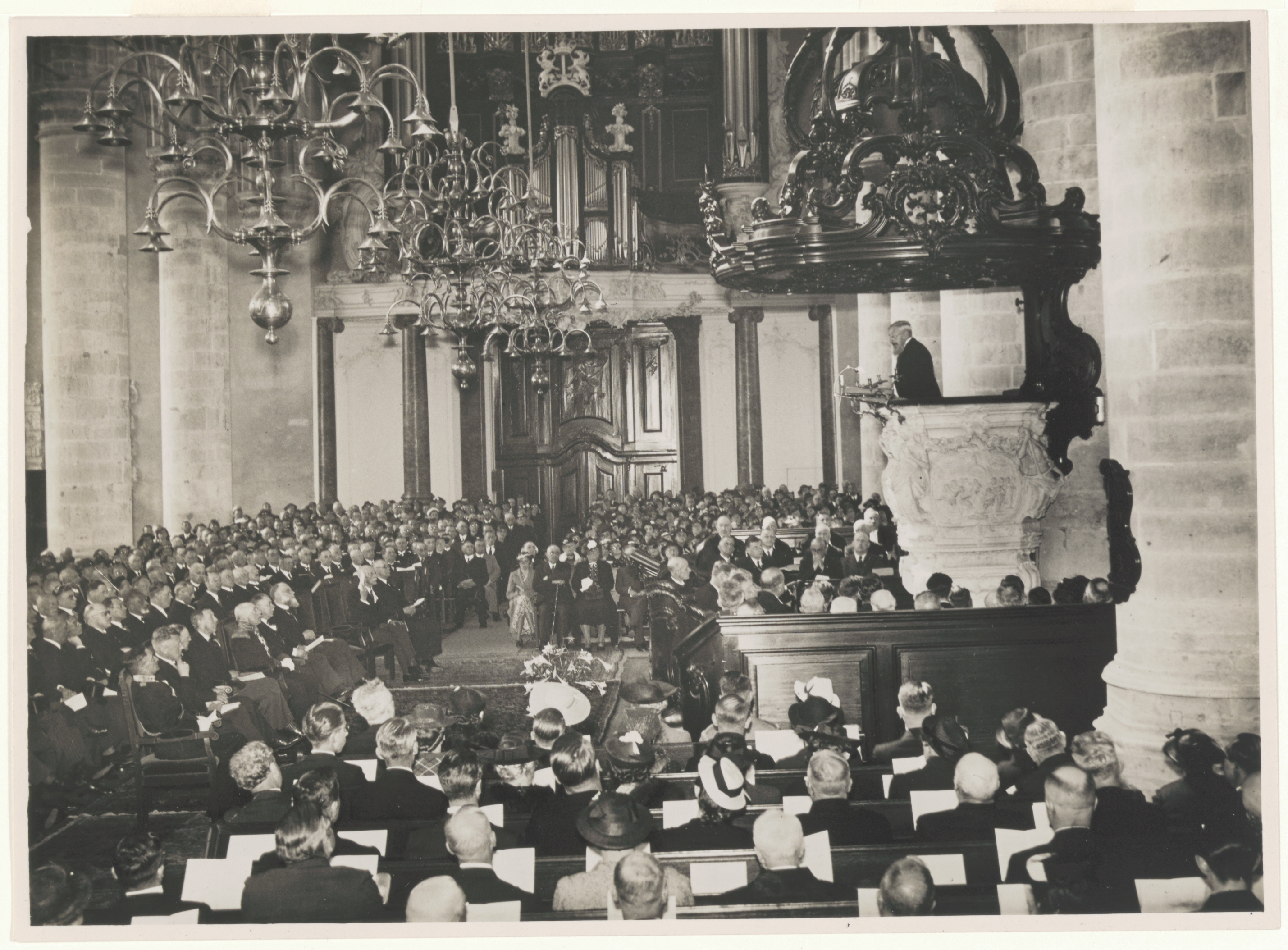 - Genodigden bij de heropening van de Grote Kerk na de restauratie. Op de kansel mr. K.K. Douw van der Krap, voorzitter van de restauratiecommissie.