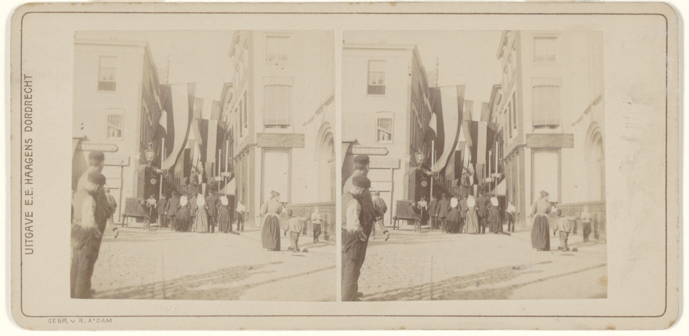 - Stereofoto van de Voorstraat vanaf de Visbrug naar het oosten. Rechts de Waalse kerk.