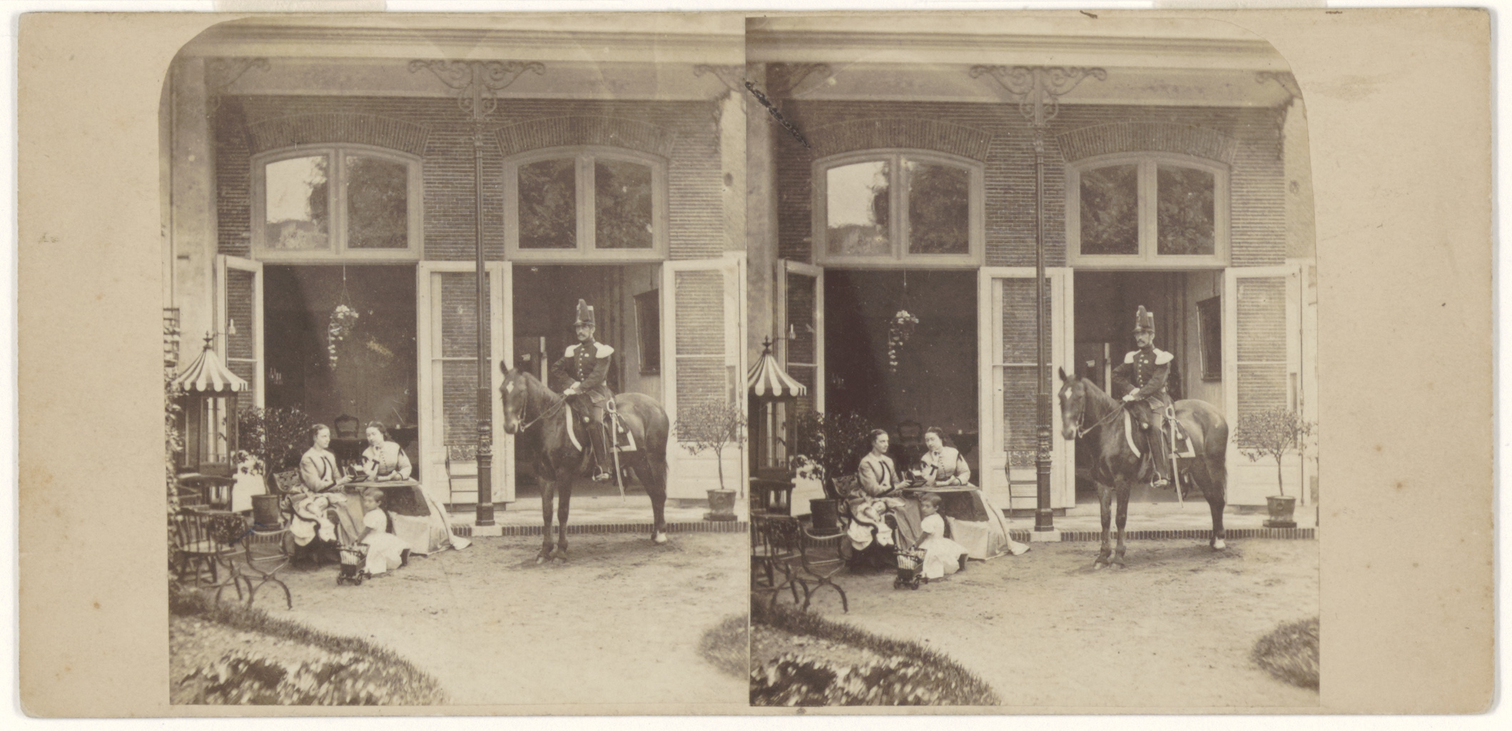 - J.A. Smits van Nieuwerkerk (1820-1893), Majoor-Commandant der Dienstdoende Schutterij, te paard achter zijn huis aan het Steegoversloot / hoek Schoolstraat, waar zijn vrouw buiten zit met een stereoscoop in haar hand, met mevrouw De Voogd-Bouvy en Anna Bouvy, circa 1865.
