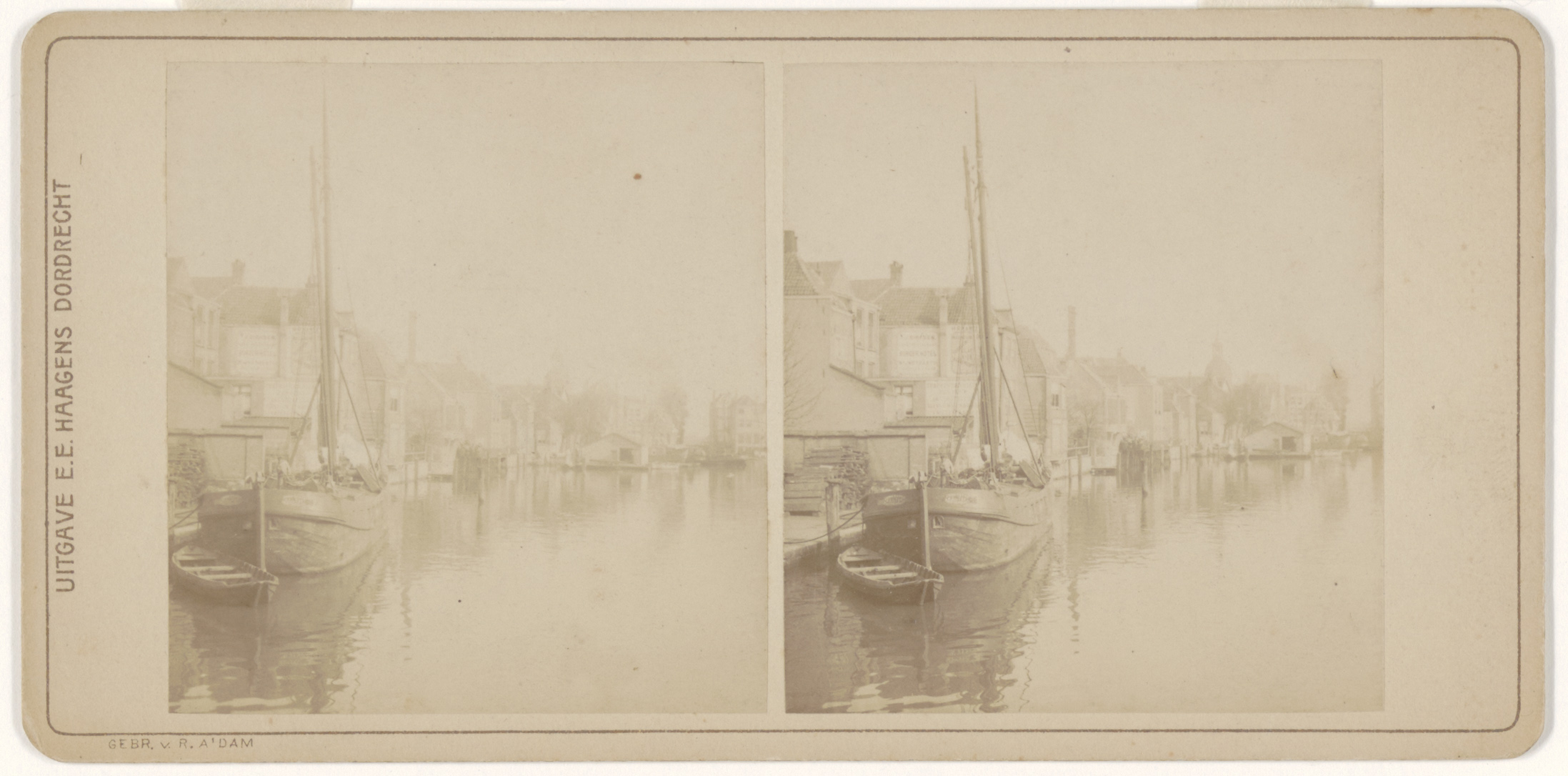 - Stereofoto van de Wijnstraat langs de Wijnhaven met het botenhuis van de roei- en zeilvereniging, gezien vanaf de Nieuwbrug richting Boombrug. Het schip ligt aan de Kraansteiger.