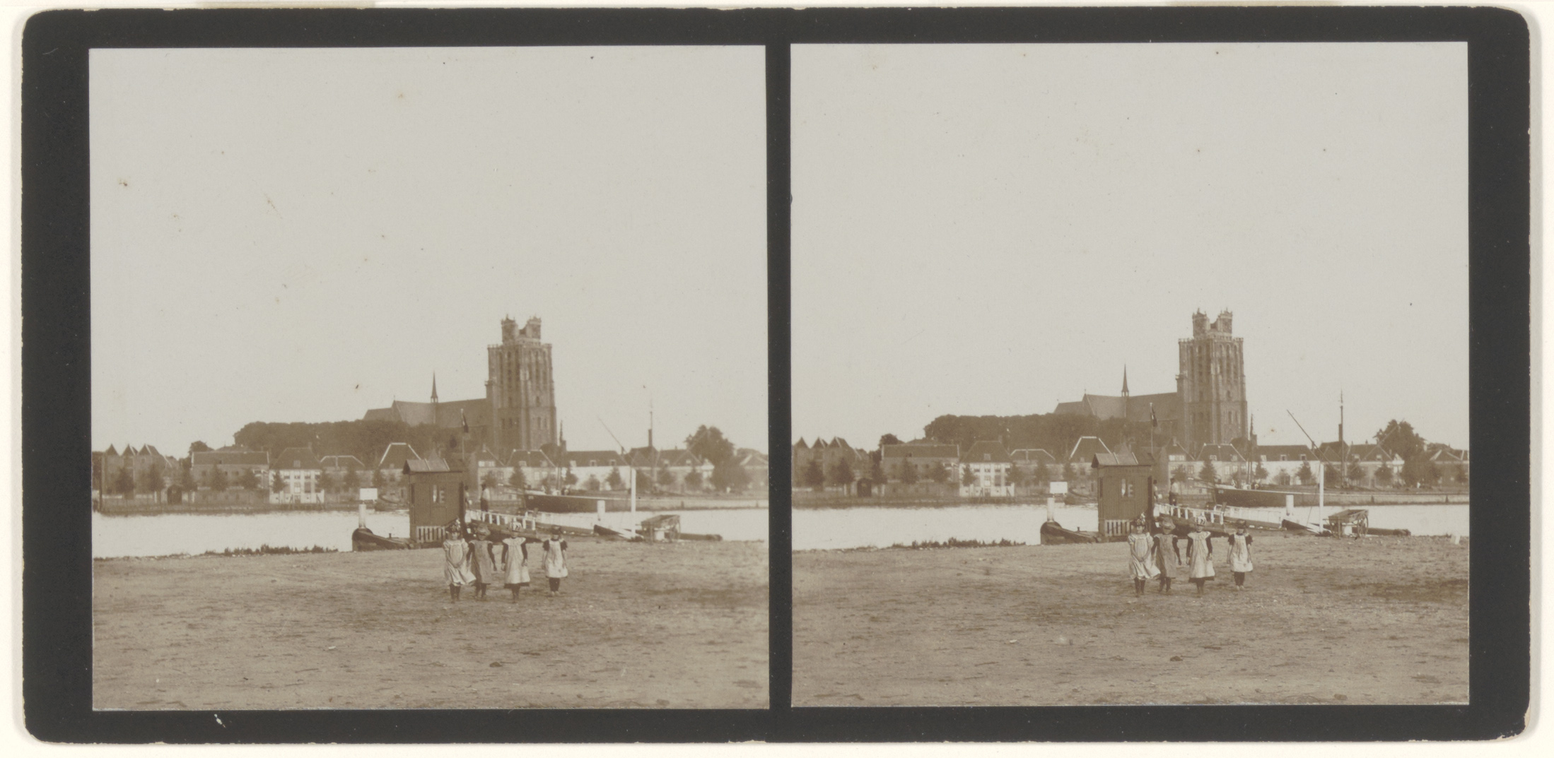 - Stereofoto vanaf het Veerplein in Zwijndrecht over de Oude Maas naar de Hooikade en Grote Kerk.