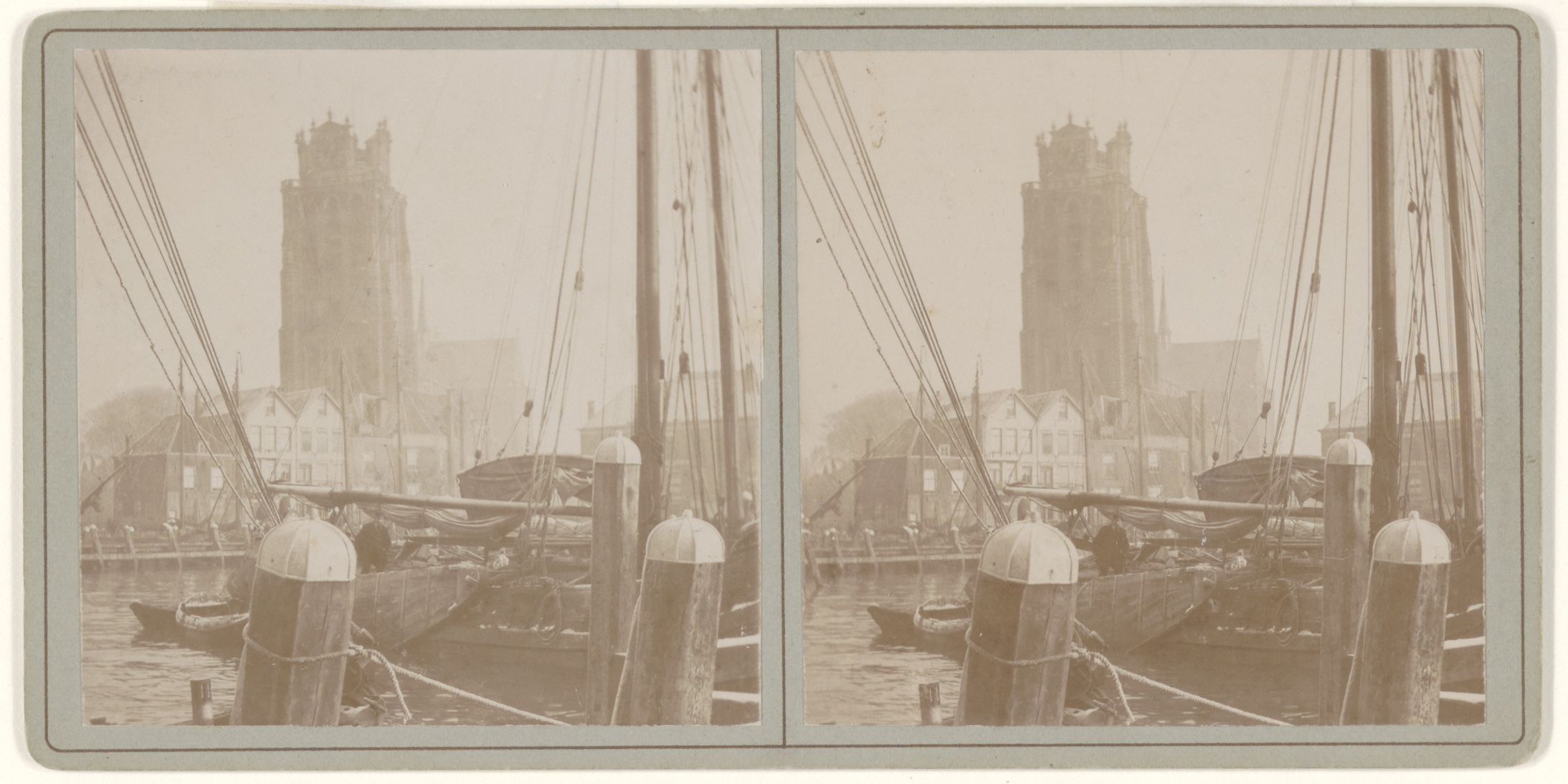 - Stereofoto vanaf de Bomkade over de Bomhaven naar de Korte Geldersekade en Grote Kerk gezien.