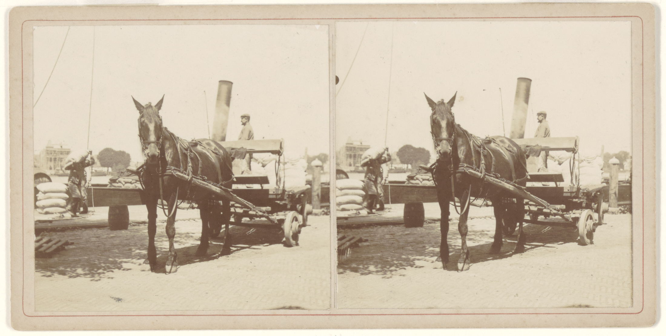 - Stereofoto van lossers (mazelaars) op de Hooikade. Op de achtergrond hotel Het Witte Paard in Zwijndrecht.