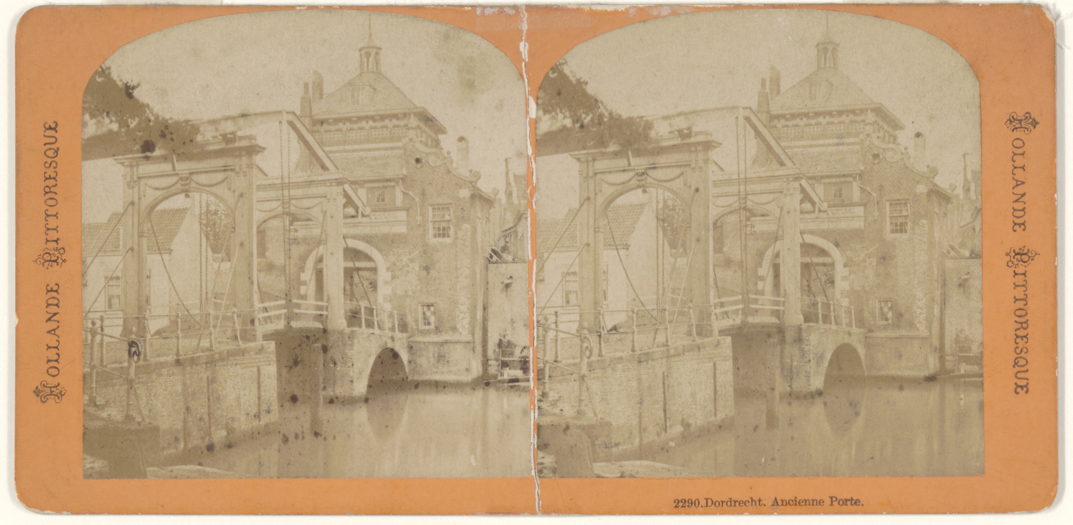 Stereofoto van de Spuipoort en de Spuibrug over de Spuihaven.