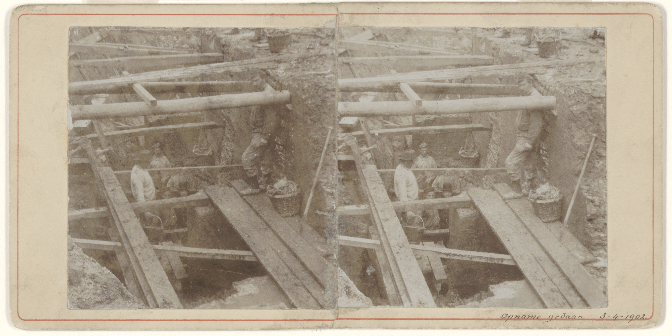 - Stereofoto van de opgraving van een vestingmuur; locatie onbekend.