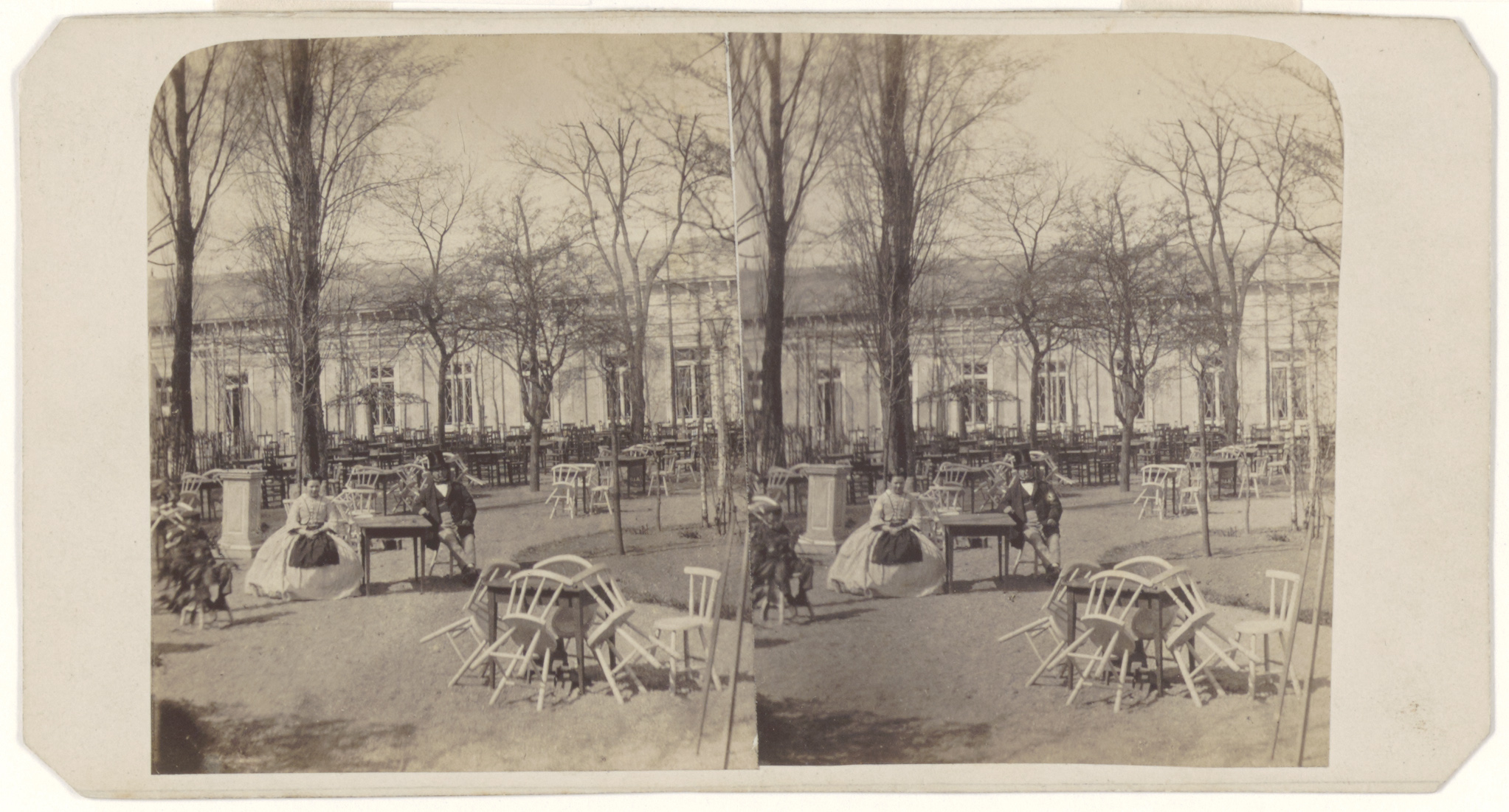 Stereofoto van de tuin van schouwburg Kunstmin aan de Godfried Schalckensingel.